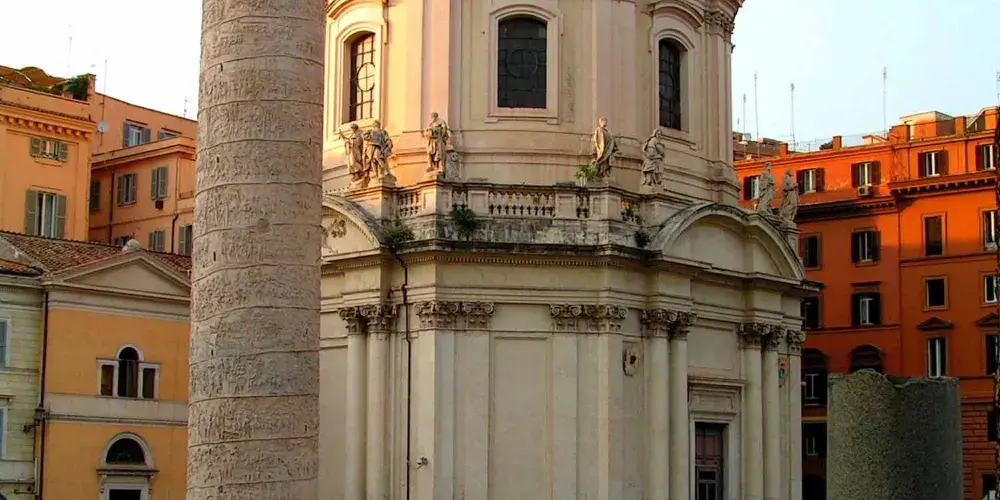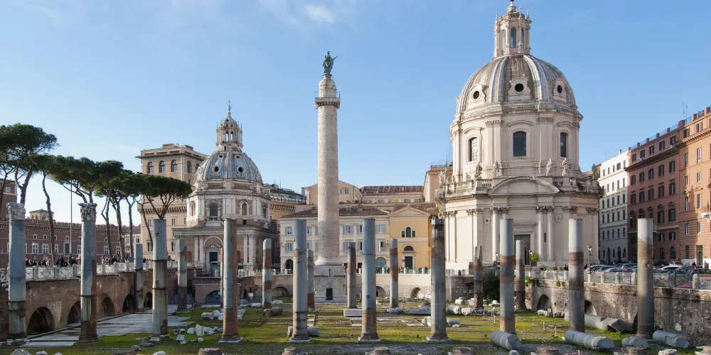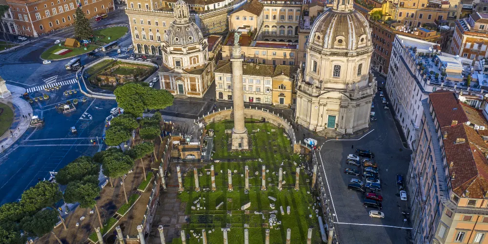 圖拉真紀念柱在廣場最西側,記錄著皇帝征服羅馬尼亞地區的戰功。18塊希臘產的大理石砌成高30米的圓柱,表面雕刻著達齊亞戰爭場面的宏大畫卷,雕刻精美,氣勢恢弘,僅各種人物就有2500多個。浮雕按故事情節分,從下往上總長達200米。