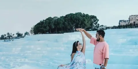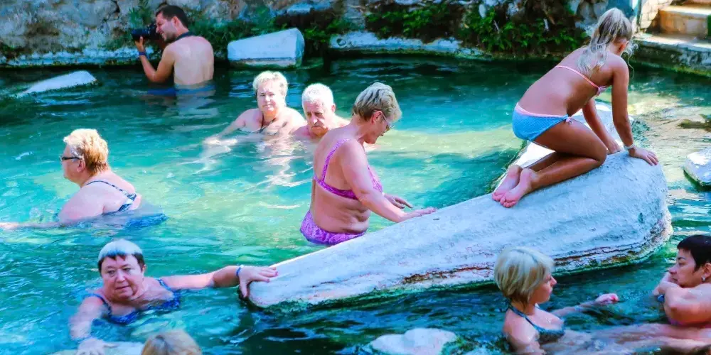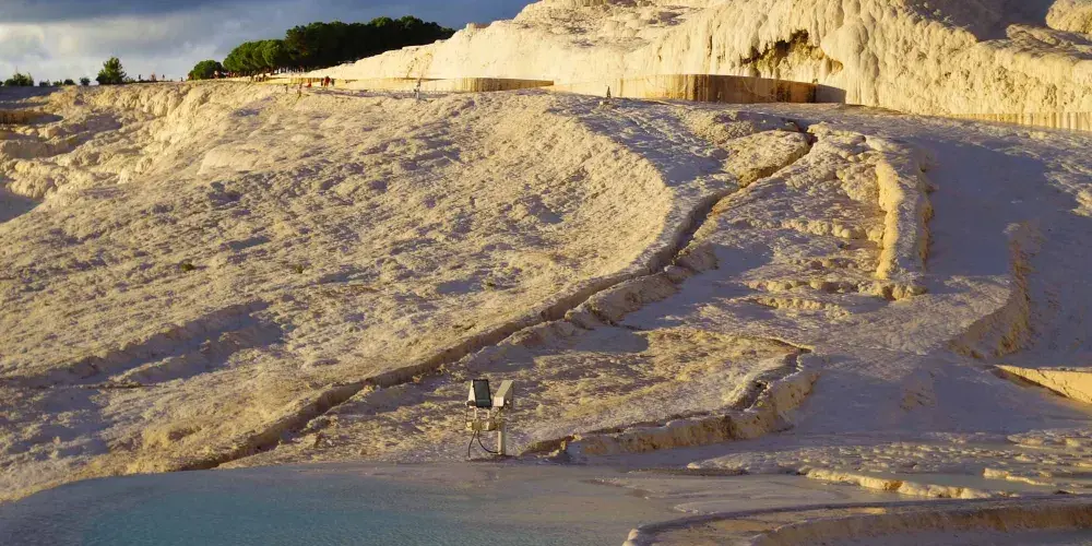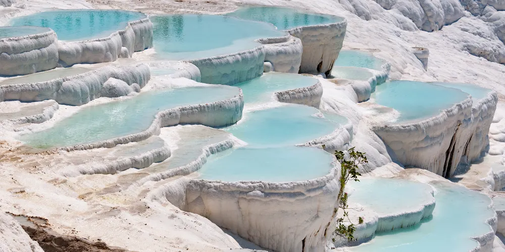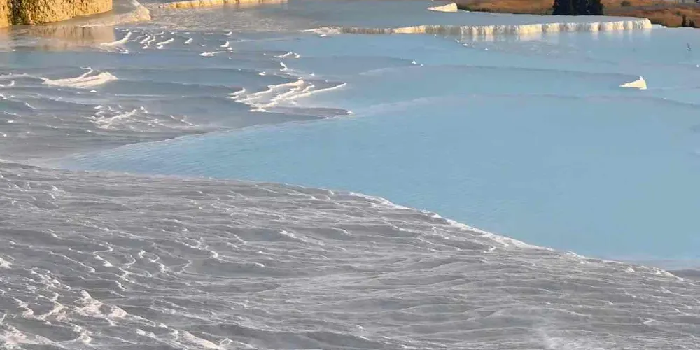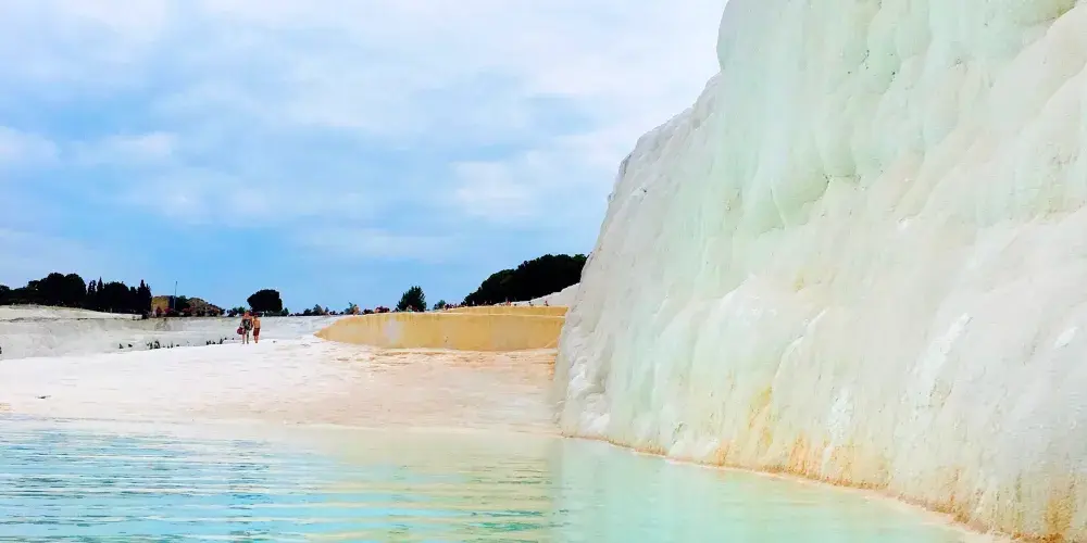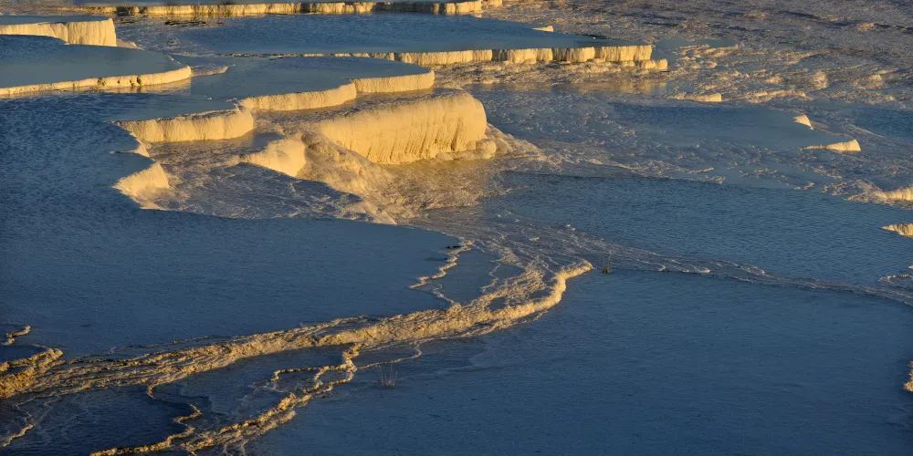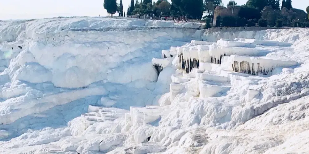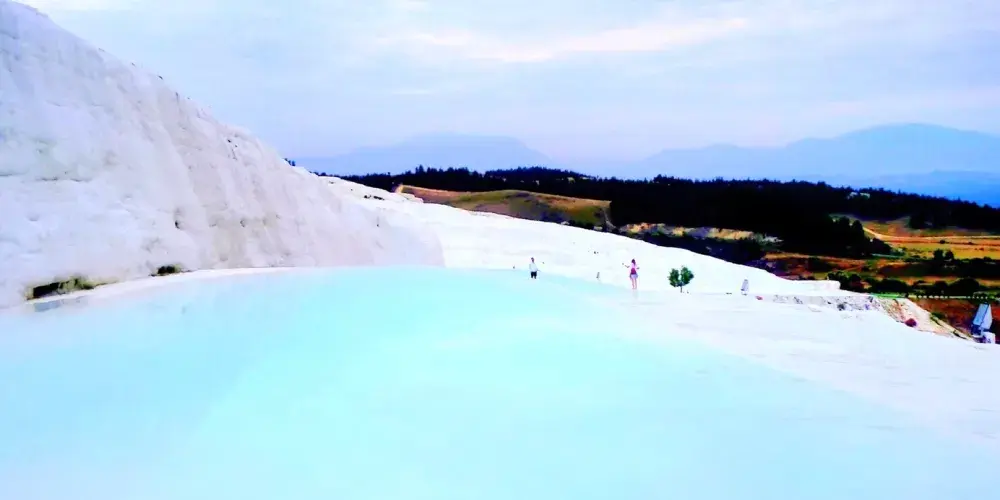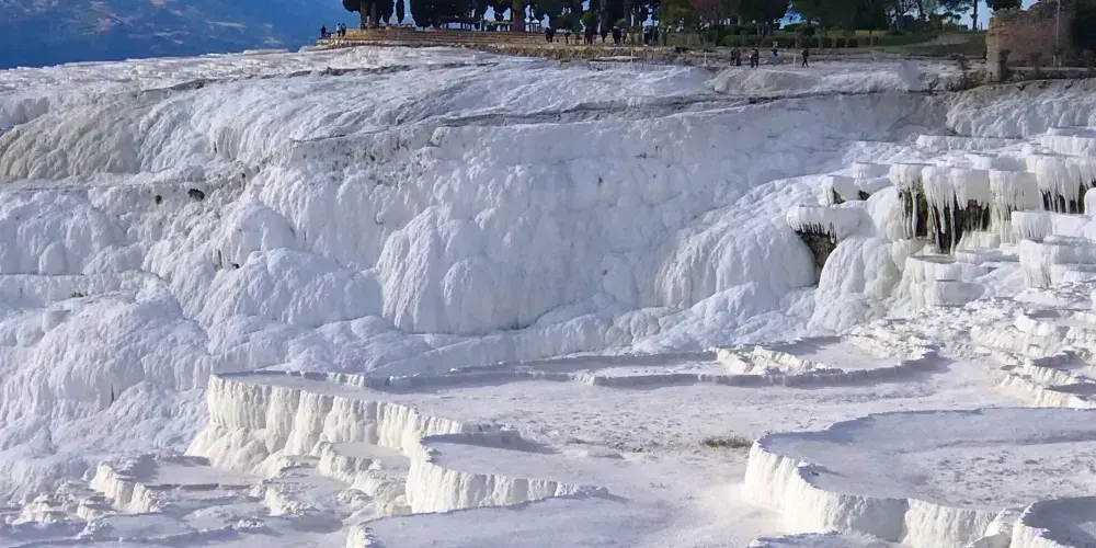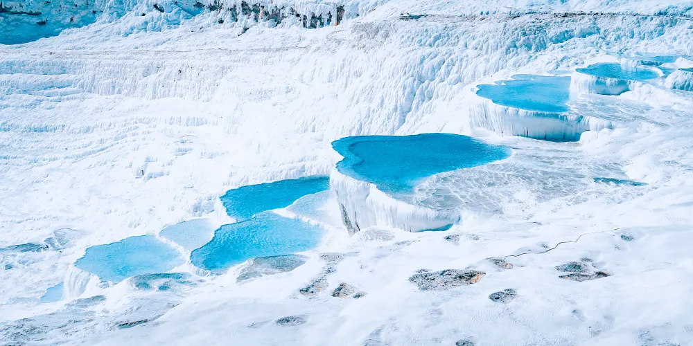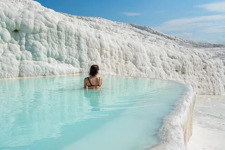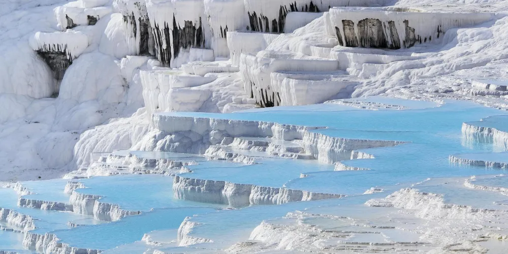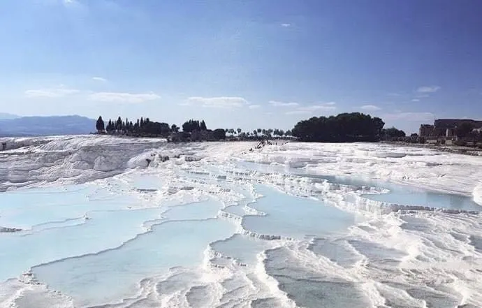 進入棉花堡溫泉池要先赤腳行進250米才能到達上方平台,玉一樣的半圓形白色天然階梯層層疊疊,猶如雪砌的梯田,遠看像大朵大朵的棉花矗立在山丘上,無數涓涓細流從丘岩間的縫隙潺潺流下,溫熱的水蒸氣讓棉花堡氤氳在淡淡的縹緲霧氣裡,泉水積在台階之間,形成一汪汪波瀾不興的水池,這便是有世界七大奇觀之譽的土耳其棉花堡。從遠古起,土耳其溫泉就聞名於世。