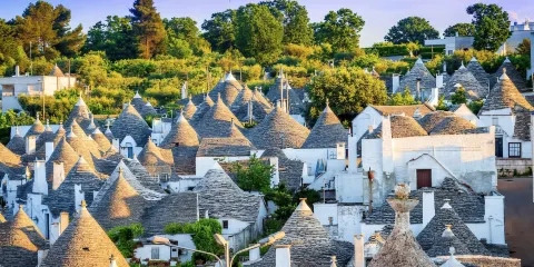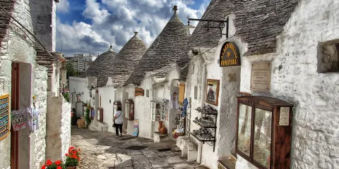 Trulli是傳統阿普利亞式房屋,它們的圓錐形或者是金字塔形屋頂(名稱源自希臘語τρούλος,或“圓頂”)是石砌建築的傑出代表,這種建築技術歷史可以追溯到史前時代,並且今天仍在阿普利亞地區使用這個技術。它們作為家畜牧圈舍或者農業用具的存放處分散遍佈整個Itria山谷,但在Alberobello地區,您會欣賞到這種建築的集羣,僅在歷代的地區中心就有超過1500座,幾乎都是處於完好無損的狀況。Alberobello地區的trulli古建築是作為重大歷史價值的附着城市景觀風貌的自發性建築結構的傑出代表,於1996年被列為聯合國教科文組織登記在《世界遺產名錄》中。