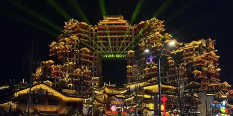 土家風情園座落於湖南張家界市城區,是一顆與張家界自然山水交相輝映的璀璨文化明珠。以當地湘西的土司城堡為基礎建造而成,在這裡可以領略到土家族山寨風貌和精彩的土家族民俗風情。遊玩時還有機會觀看到土家族古老的茅古斯舞,傳統的茅古斯舞一般在逢年過節跳擺手舞之前進行,整場舞蹈開場前,要祭祀土王、唱祭神歌,祈禱賜福降瑞。