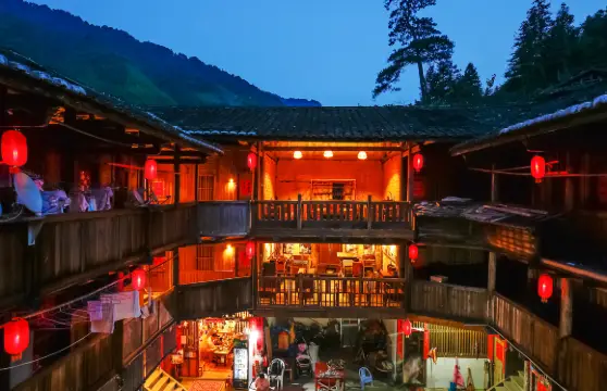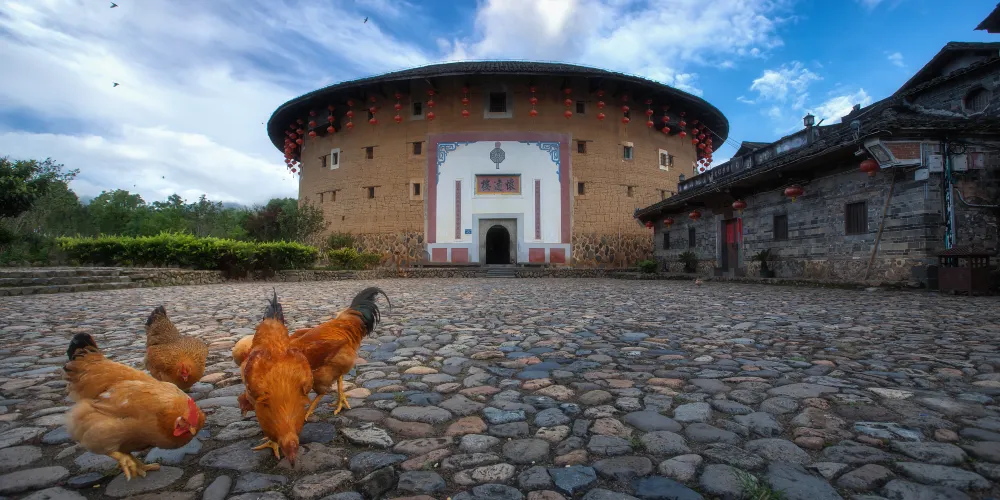 河坑土樓群位於漳州市南靖縣書洋鎮曲江圩河坑自然村。其中獅子山觀景台是河坑土樓群的理想之地,站在獅子地凍山頂可以從三個方位看到不同造型的三個土樓群共有27座。土樓中間是個天井,周圍平均分割成若干格子。圓樓的房間呈現斧頭現狀,站在天井張望,酷似一隻高大的木桶,頗有坐井觀天之感。