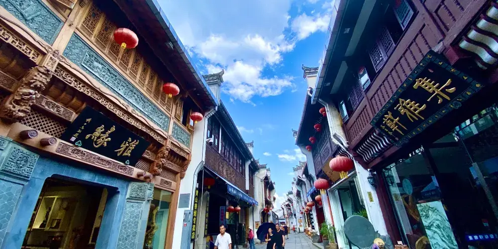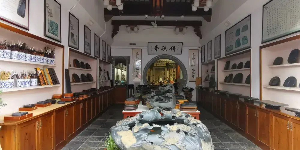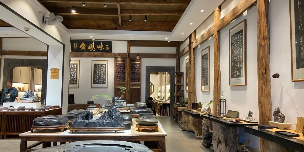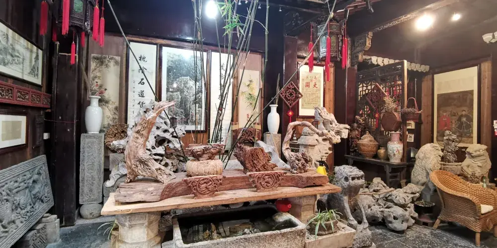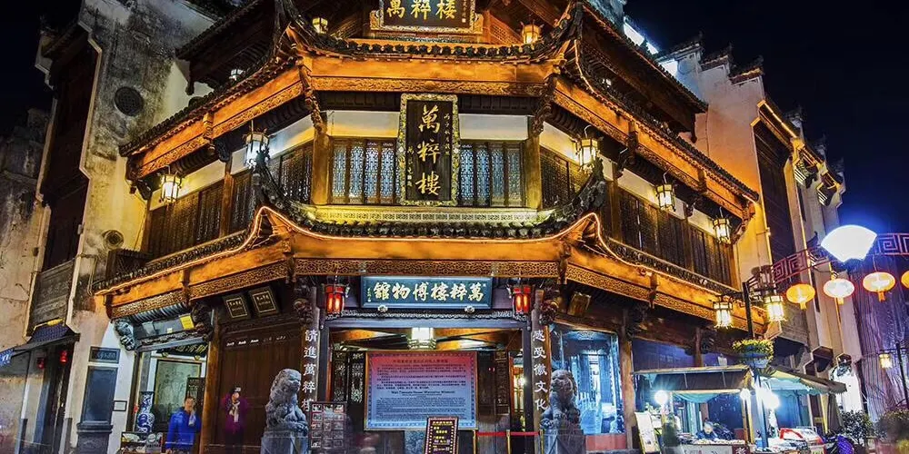黃山市老街古玩藝術珍寶博物館,位於屯溪老街三馬路32號,總建築面積約1萬平方米,完全按照現代大型博物館的展陳、燈光、安保等要求精心設計、精工細作打造而成。館內藏品以中國古代文化藝術精品與宮廷珍寶為主,涵蓋玉器、石雕、文房、竹、木、牙、角雕刻、書畫、傢俱等10多個門類。老街古玩藝術珍寶博物館是集展覽、鑒定、交流購物休閑等多功能為一體的綜合建築。推開古樸莊重的博物館大門是明亮寬敞的陽光玻璃庭院,院內設有休閑茶座。進入宮殿式的大廳有自動扶梯可到負一樓,一樓展廳外是文房四寶、名人書畫、古玩、玉器等工藝品商場。進入自助檢票口,是古玩藝術珍寶博物館一層展廳。陳列了世界罕見的漢代石虎、鑲嵌着徽州民間藝術(磚雕石雕木雕竹雕)的古老紅木傢俬、大塊名人石刻碑帖等大型展品。二樓展廳為精品珍寶展館。展品有:宮廷珍寶、精美絕倫的各種象牙、觸角雕刻、惟妙惟肖的美玉、石器、歷代名家瓷器、金銀器皿、絲織刺綉、名人字畫等令人歎為觀止。二樓展廳外有茶道、沉香、及博物館古玩藝術品文物商場;三樓是“非遺”傳承人的藝術品展廳。展廳外是露天茶吧,在此可享受自然風的吹拂、回味參觀作品的神韻。稍作休息,還可重返展廳欣賞自己喜歡的作品。每層展區面積均超過1000平方米。