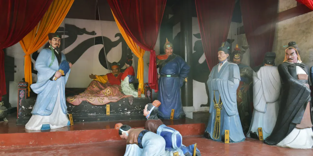 蜀國皇帝劉備的結拜兄弟關羽敗走麥城,死於刀下後,劉備為他報仇,不聽眾臣勸阻,起兵討伐東吳。途中另一個結拜兄弟、伐吳先鋒——張飛喪身叛將範疆、張達手中,劉備憤而不謀,催兵猛進。章武二年夏六月,被東吳大將陸遜用計火燒七百里軍營,在敗於彝陵猇亭之地,因而退守到白帝城中。三國久未統一,兩弟先後喪命,大軍新遭重創,國事私仇使劉備憂憤成疾,眼看朝不保夕,乃招丞相諸葛亮星夜趕至。在永安宮中,劉備把兒子劉禪(阿斗)委託於諸葛亮。然後便一命歸天了。從此,白帝城就因這段膾炙人口的故事而更加聞名於世了。現在的託孤堂位於白帝廟前殿。為了再現1700多年前永安宮劉備託孤的悲壯歷史,白帝城博物館特邀雕塑家趙樹同先生,於1984年創作了一組劉備託孤大型彩塑。21尊高2米多的蜀國君臣彩塑,造型生動,形態各異,個性鮮明,具有強烈的藝術感染力。