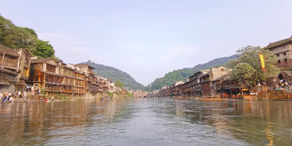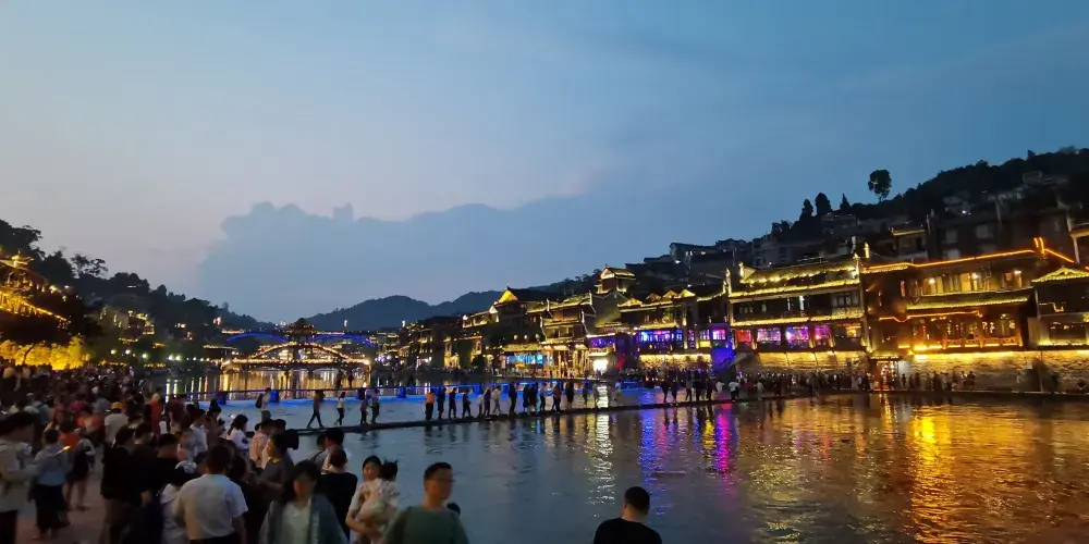 從跳岩中間來眺望沱江,可以欣賞到古城美景,跳岩中段是拍攝沱江美景的取景點,等同於站在了沱江的中心,可將兩岸的吊腳樓、對面的虹橋風雨樓,和來往的小船都收入鏡頭內,所以這裡可以說是鳳凰古城頗受歡迎的攝影之一。對於一般遊客來說,到了古城,也必要走一走跳岩,聽腳邊沱江之水流淌而過,才不枉來一趟鳳凰古城。
