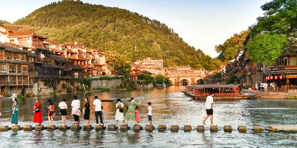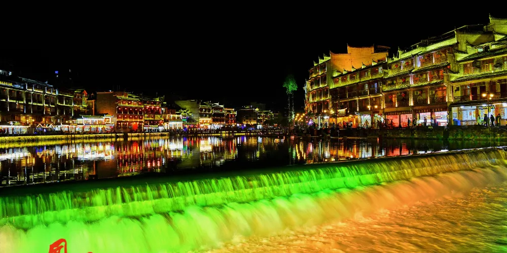 沱江跳巖,是鳳凰城古城的標誌性景點之一,位於古城北門外的沱江上,全長約100米,共15個岩墩。沱江跳巖始建於清康熙四十三年(1704年),當年這裡是東北向進出鳳凰古城的主要通道之一。因為人們經過時必須踩著這一路岩石,一跳一跳地過河去,「跳岩」便因此而得名。
