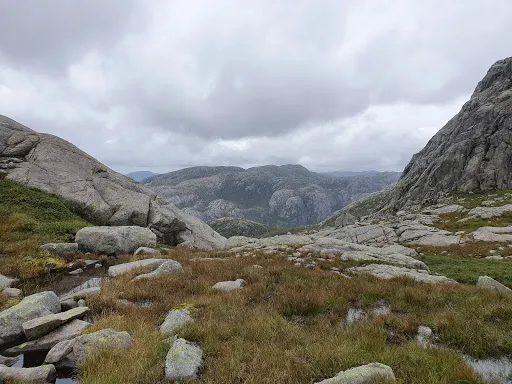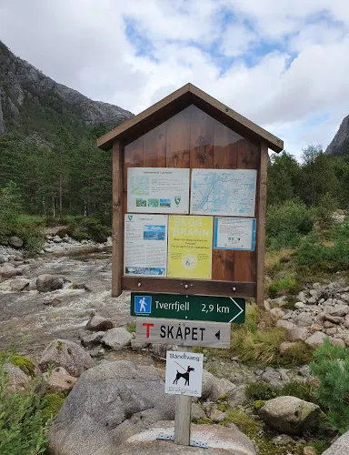 徒步線路旁都設有醒目的指示牌和紅色T字標記,官方給出的線路分為3段:最開始沿大路緩坡徒步1.5公裡左右,翻過兩座小山;垂直上山1公裡左右,到達中段平台,可以欣賞Revsvatnet湖的美景,這裡有一段路為石子路,旁邊並沒有護欄,要注意安全;最後上山衝刺1公裡,爬到山頂。在這塊渾然天成的岩石上,盡情領略呂瑟峽灣的風情,起伏的山巒、蜿蜒的峽灣,以及峽灣中星星點點的遊船盡收眼底。