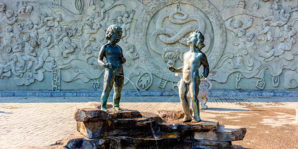 主體雕塑是一對年輕的哈尼族夫妻,哈尼婦女肚子突起。夫妻倆彎曲雙腿、手持貢品,他們正向天神祈求,保佑他們的雙胞胎平安降生。一方水土養育一方人。在墨江,由於人們常年喝雙胞水,也就促成了生雙胞胎的重要條件之一。雙子星廣場上的陰陽井,墨江北迴歸線標誌園剛好從兩口井之間穿過。想要求雙胞胎的夫妻,到這裡就要喝一喝陰陽水、睡一睡雙胞床,然後還可以結一把同心鎖。