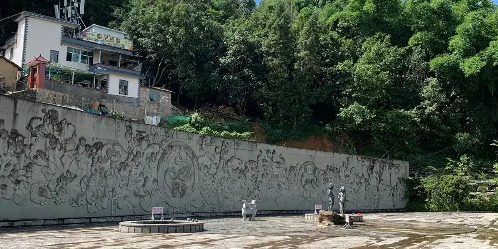 哈尼族用來進行神聖取火儀式的廣場。由三條氣勢磅礴的龍組成了哈尼族家裡火塘中常用的三角灶。哈尼族是火的民族,火塘在哈尼族的家庭中具有非常重要的存在性,它是一個家庭的「核心」,長者常在火塘旁給下一代講述祖先的故事和傳授生產生活知識。同時,邊說邊要往三角灶中加柴,避免灶中的「火魂」離散,保佑全家安康、幸福。