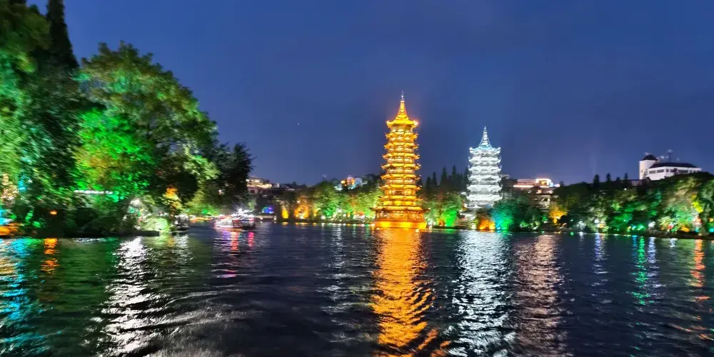 乘船夜遊兩江四湖可觀賞到杉湖、榕湖、桂湖、木龍湖、灕江、桃花江市內段的山水風光,遊覽桂林市核心的風景帶,體驗能與威尼斯水城相媲美的環城水系。