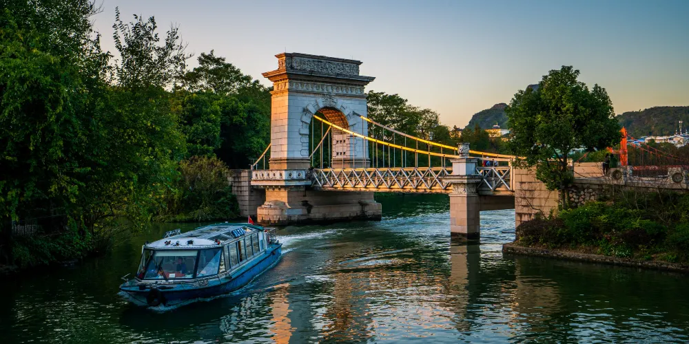 亮點及特色:乘船日遊桂林市區核心的環城風景帶,可近距離欣賞如詩如畫的山水自然風光,沿途象鼻山、伏波山、疊彩山、七星山、寶積山、長者山等諸多名山依次呈現;形態各異的中外名橋、大氣典雅的寶塔樓閣粧點着古老的山水名城,讓遊客真實感受到桂林山水甲天下的風采。