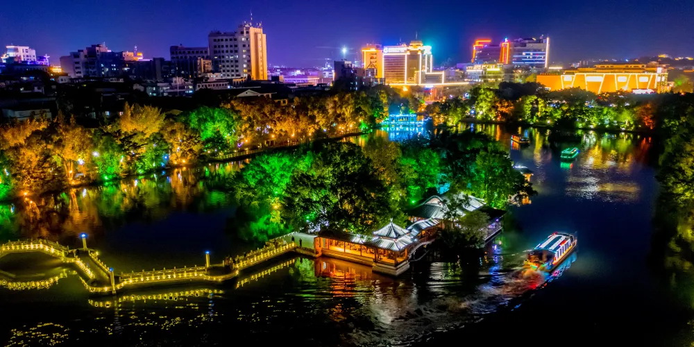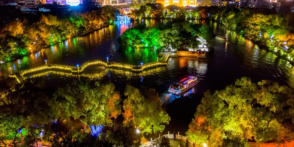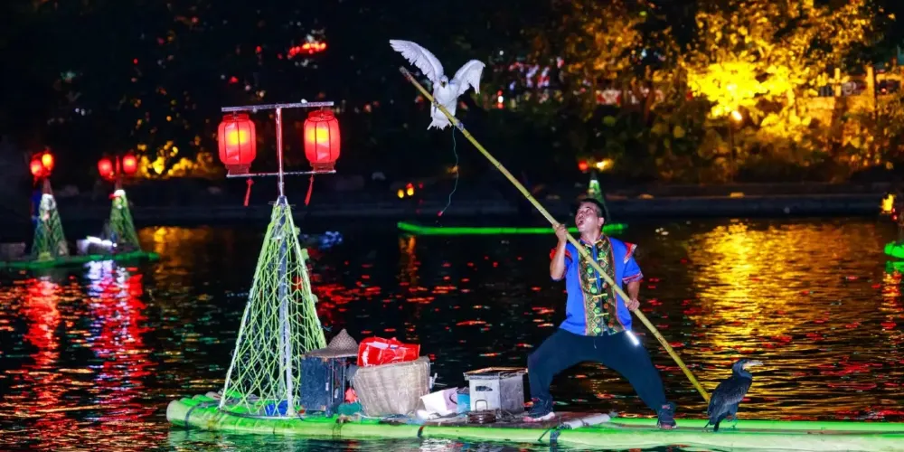 乘船夜遊四湖可觀賞到杉湖、榕湖、桂湖、木龍湖的璀璨夜景風光,以及有千年歷史的魚鷹捕魚等經典演藝。