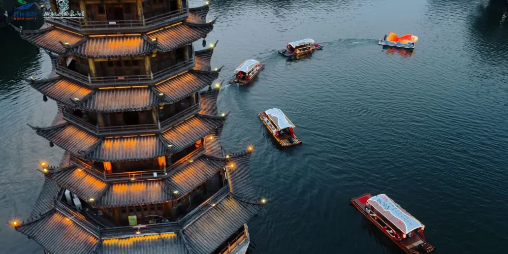亮點及特色:夜遊兩江四湖產品是我景區經典的產品之一,乘船沿途不僅能夠欣賞四湖風景名勝、名橋名山;觀賞傳承千年的魚鷹捕魚、瑤鄉風情、半箏落月等精品演藝,還能舟遊灕江以及桃花江,感受桂林“城在景中,景在城中”的山水精髓集萃,縱享夜桂林的璀璨魅力。