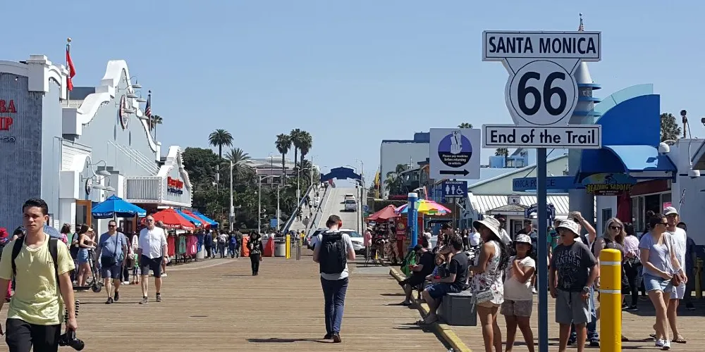 美國66號公路(Route66)終點,位於加州洛杉磯聖塔莫妮卡。66號公路被美國人親切地喚作“母親之路”。在美國版圖上呈對角線的66號公路,從起點伊利諾伊州芝加哥的亞當街,一路橫穿到加利福尼亞州洛杉磯的聖塔莫妮卡港。這條美國曆史上較為有名的州際公路,一共穿越了美國8個州,途經伊利諾伊州、密蘇里州、堪薩斯州、奧克拉荷馬州、新墨西哥州、亞利桑那州以及加利福利亞州,三個時區,全長2450英里,約合3943公里,通車使用時間為1926年11月11日——1985年6月27日。
