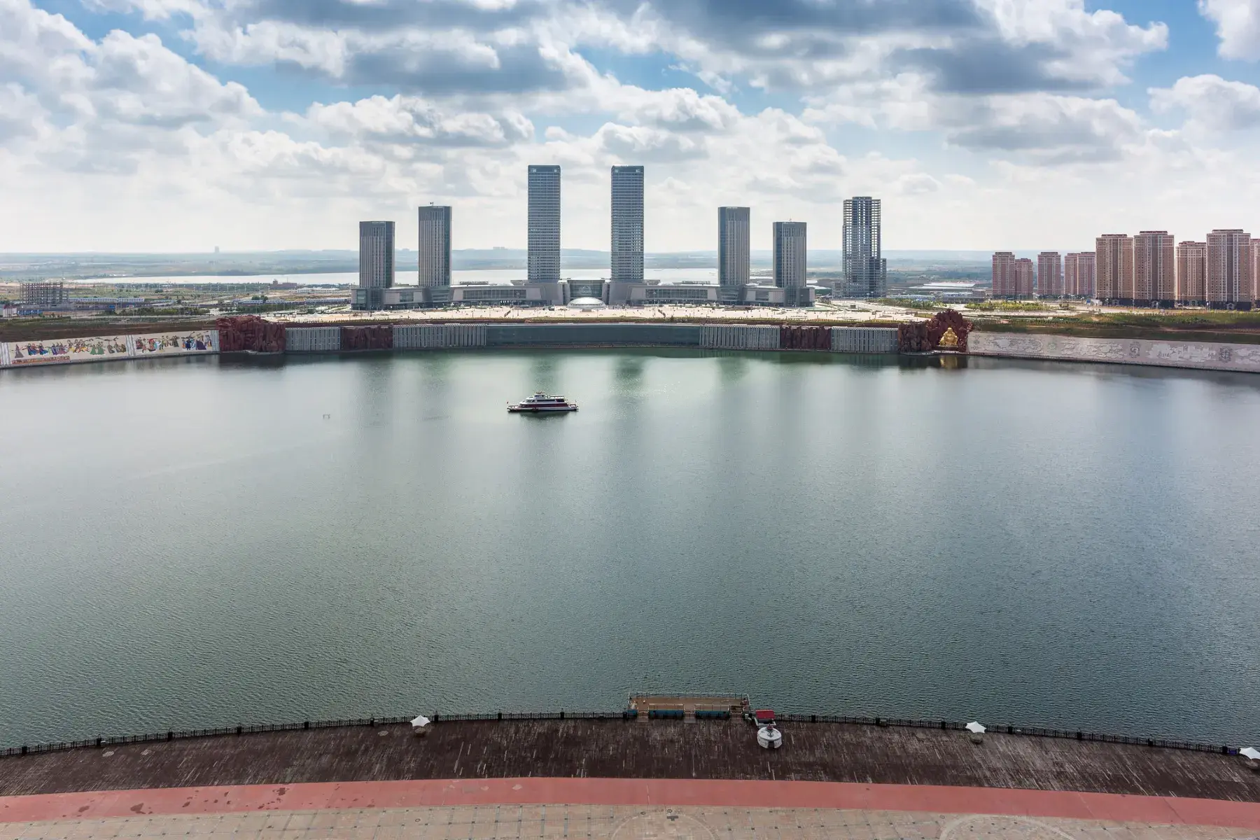 烏蘭木倫景觀湖,位於阿勒騰席熱鎮和康巴什新區之間的烏蘭木倫河上,總佔地約7平方公里。其中,兩岸陸地景觀用地約3.8平方公里。分為兩軸、兩帶、三區、六個節點,突顯「現代草原都市,大漠長河新景」的風貌。兩軸:城市景觀中軸、景觀曲軸。兩帶:北岸景觀帶、南岸景觀帶。三區:上湖風情景觀區、中湖綜合景觀區、下湖生態涵養區。六節點:大瀑布廣場節點、台地親水廣場節點、文化廣場節點、天水塔紀念廣場節點、休閒廣場節點、紅砂岩地質景觀節點。