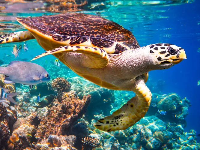 • 探索由50萬公升海水構築的水底走廊,近距離觀賞鯊魚、魟魚、石斑魚、綠海龜等海洋生物。