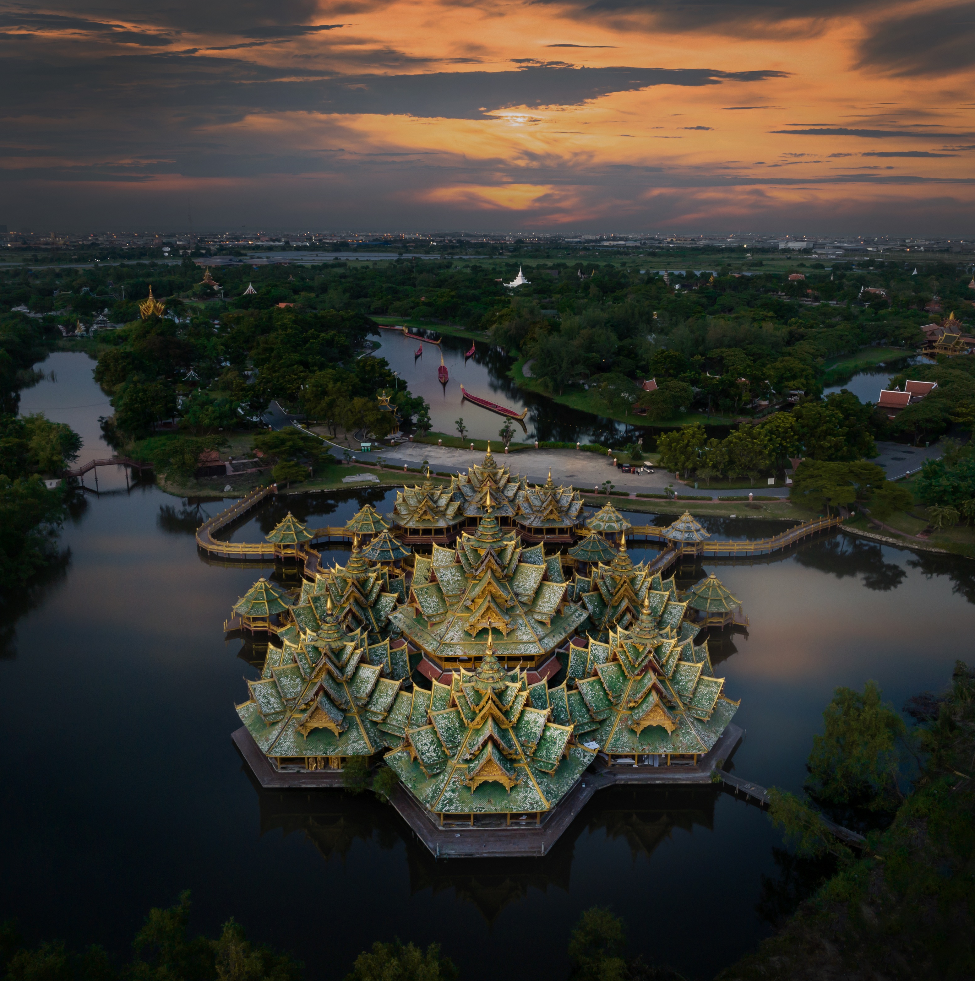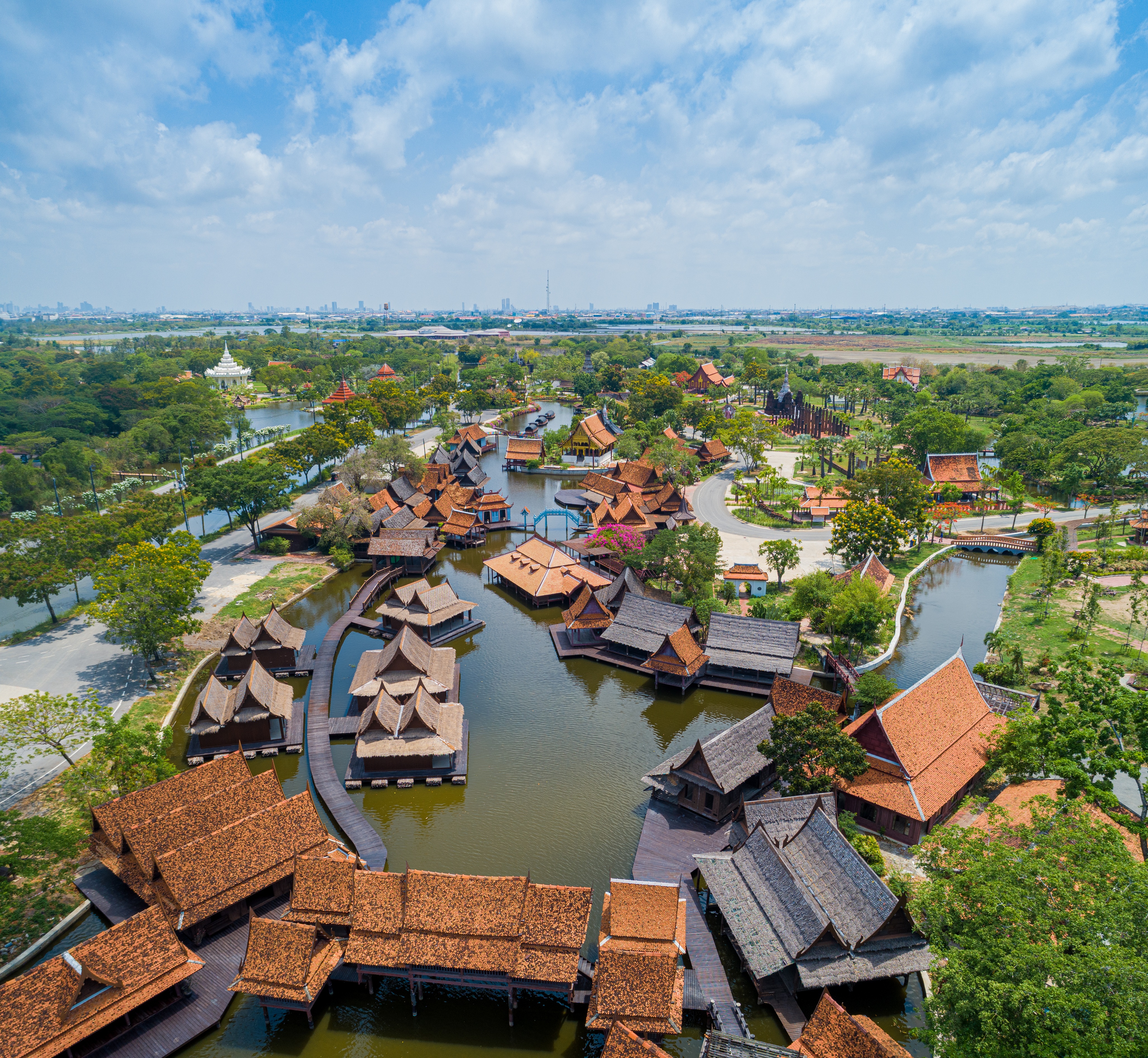 △水上市場,展示泰國中部盆地及河流周圍城市社區的特色建築,人們通常在河邊建起高腳屋,通過搖櫓划船來往於不同地方,河流的某一段通常會被選定為交換買賣商品貨物的中心市場。