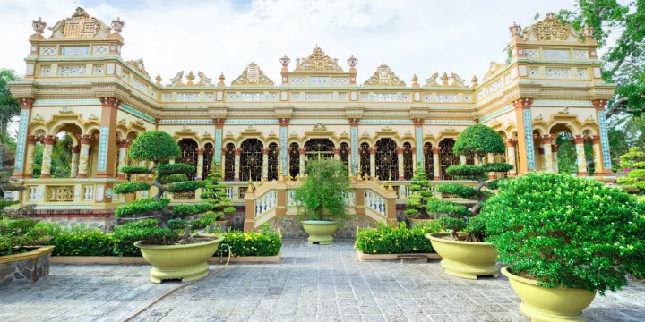 永長寺建於19世紀初,距今已有100多年的曆史,在距離西貢不遠的美拖市。永長寺是當地最著名的寺廟之一,在寺內供有數百年高僧的肉身。除此之外,在殿堂裡也供奉佛像,在院子裡也供奉著佛祖、彌勒和觀音的巨型塑像。