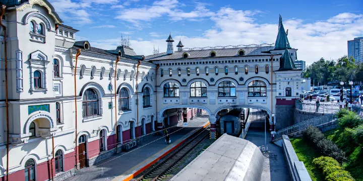 海參崴火車站是西伯利亞鐵路的東端終點,與其說是火車站,不如說是一種象徵。月台上有9288字樣的雙頭鷹雕塑,顯示從這到莫斯科的距離是9288公里。而整體極具俄羅斯風格的外觀也讓人聯想到17世紀俄羅斯建築藝術的代表作品,給人一種複雜多變的視覺美感。
