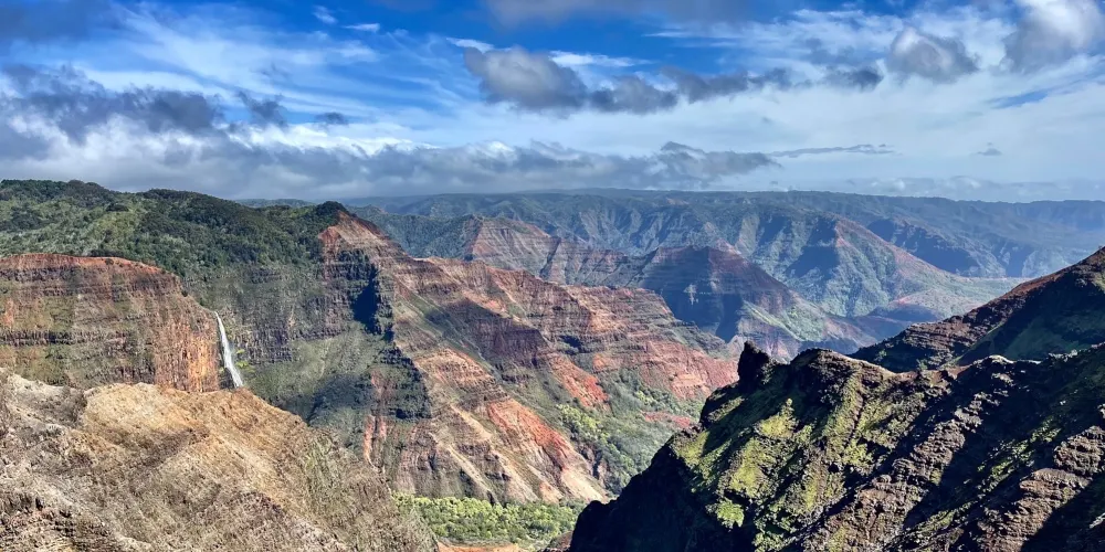峽穀裡到處都是懸崖哨壁,經過歲月磨礪,岩石表面呈現出橘紅色、深紅色,與周圍蒼翠的植被形成鮮明的對比。再加上天空的藍、雲朵的白、瀑布折射出的七彩,這裡的風光宛如水彩畫一般。