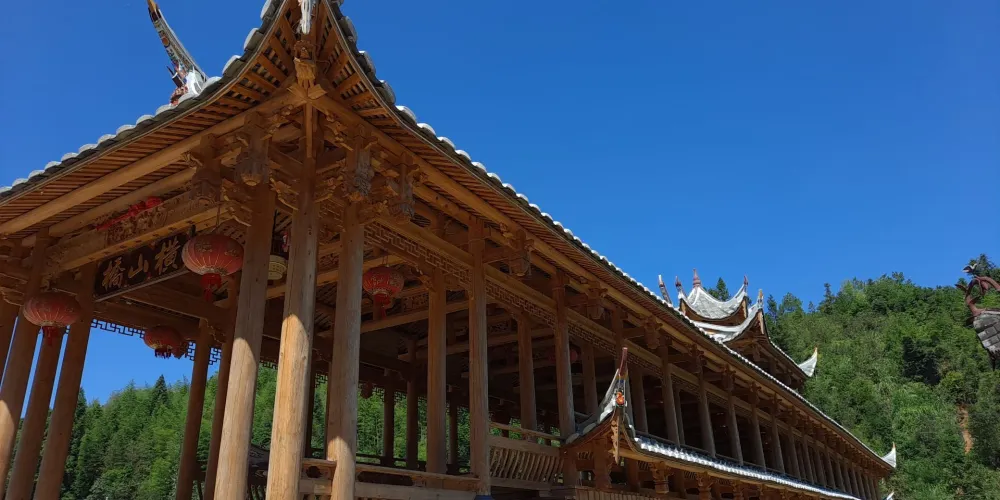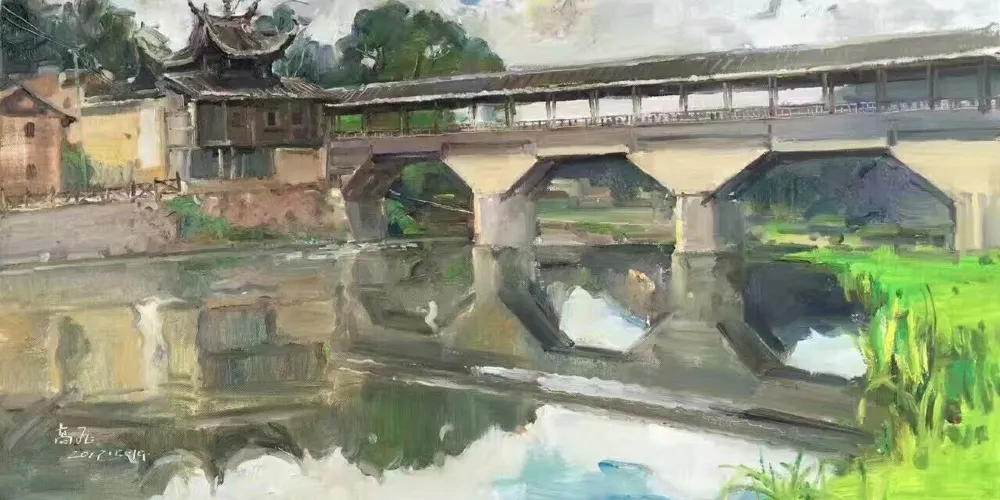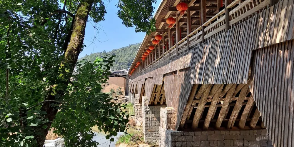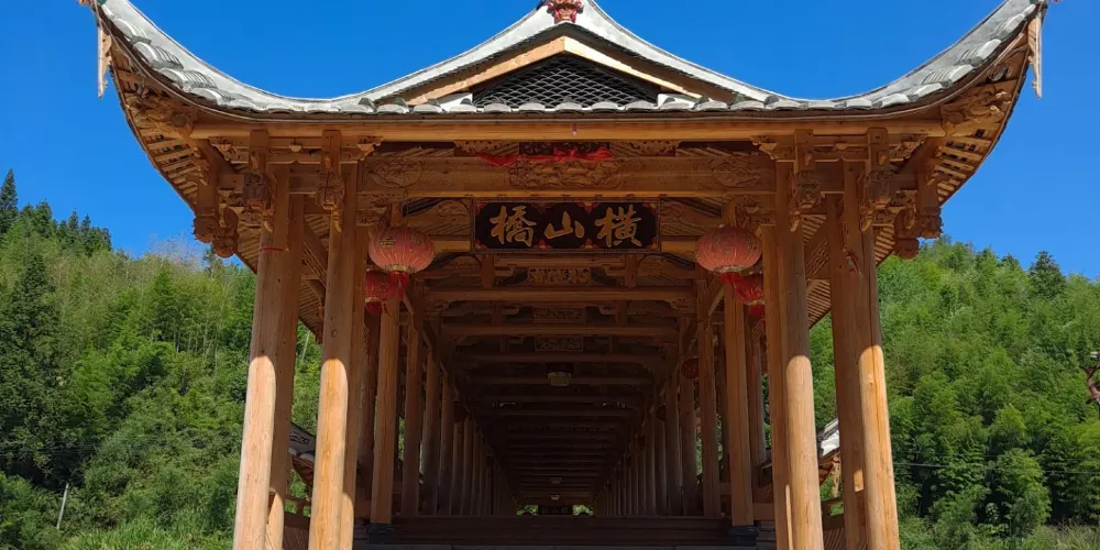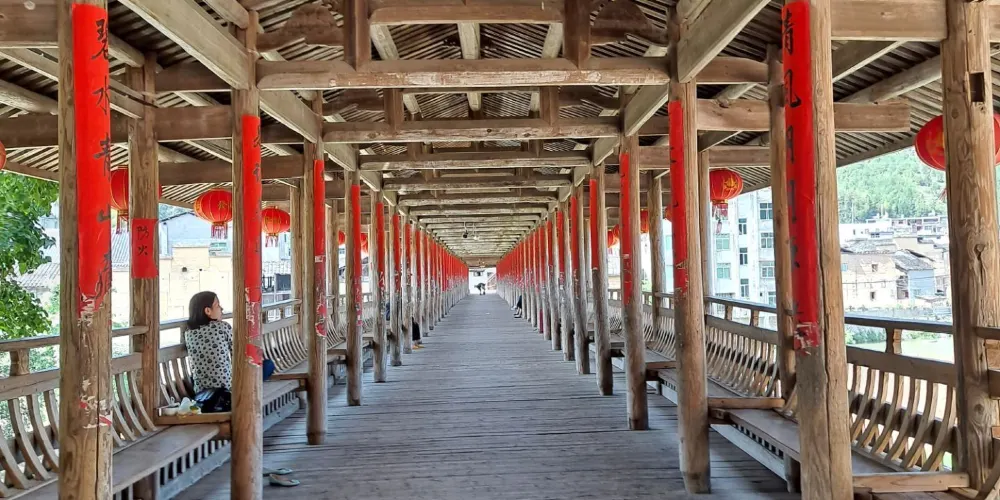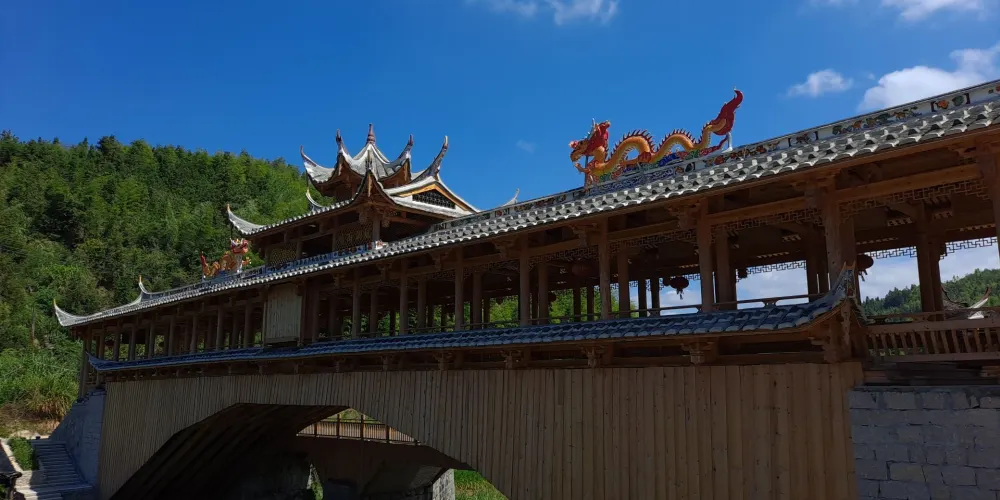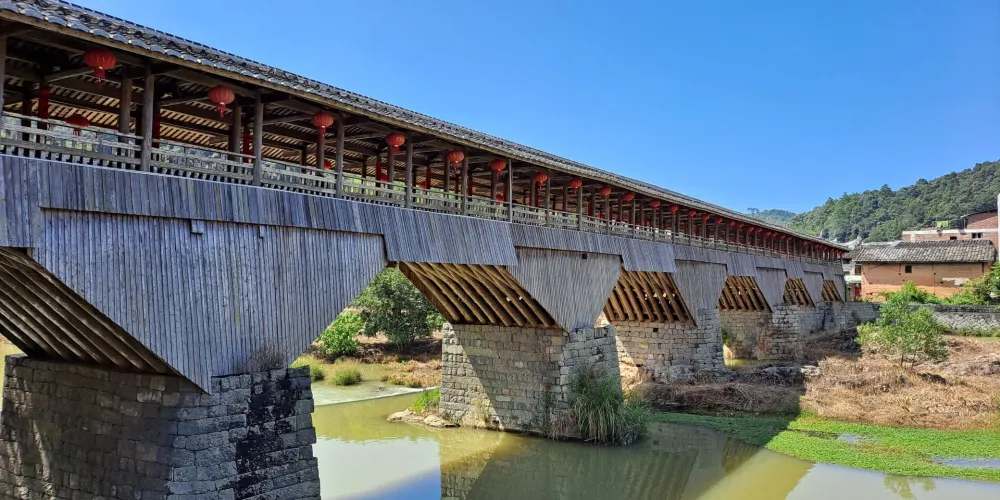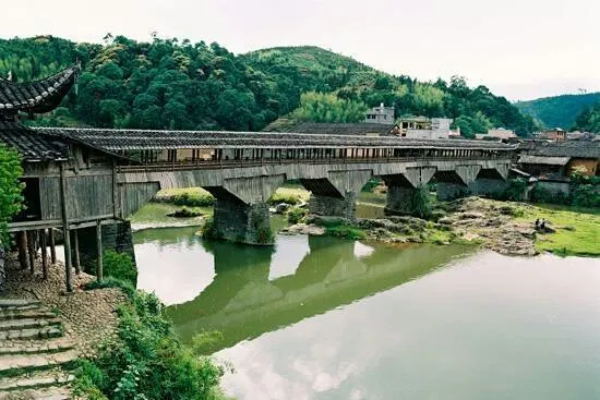 萬安橋為五墩六孔木拱廊屋橋。正中橋墩上有一嵌入橋墩的石碑,碑文雲:弟子江積舍錢一拾三貫谷三十二石,結石墩一造,為考妣二親承此良因,又為閤家男女及自身乞保平安。元佑五年庚午九月謹題。橋東端有10級石階,橋西端有36級石階,橋屋內檐下有13幅楹聯。橋西北建有重檐橋亭。穿鬥式樑架飛檐走梭,頂蓋雙披青瓦,工藝堪稱巧奪天工,氣勢雄偉,古樸端莊。對研究古橋樑建築具有重大價值。