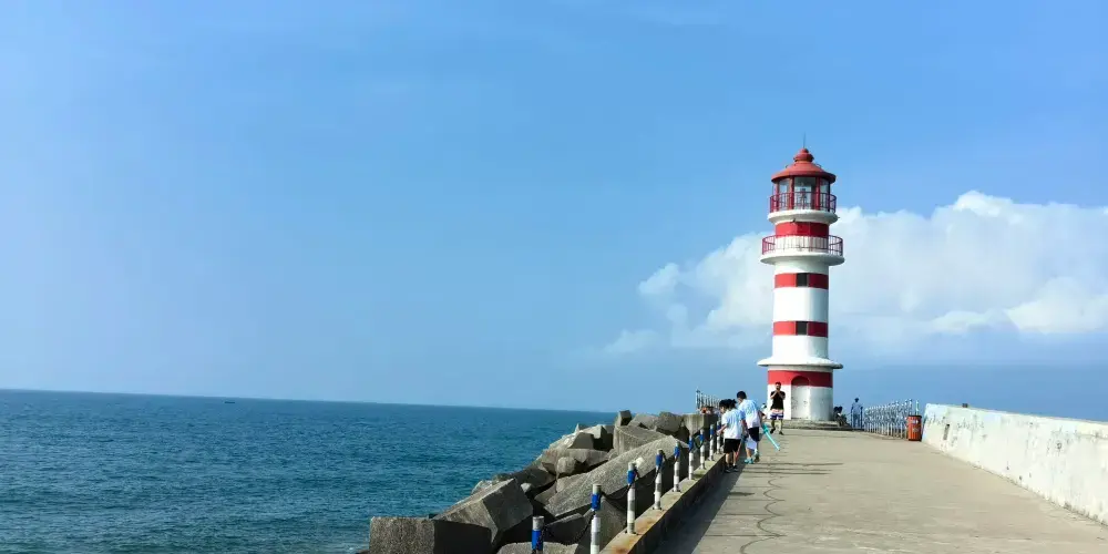 神州半島位於萬寧市東澳鎮,這裏的燈塔不僅是海港的守望者,還成為了地標性景點。沿着深入海中的護堤走進去就來到了燈塔腳下。在碧藍大海的映襯下,紅白相間的燈塔格外清新。傍晚時分,在晚霞和海水的映襯下,多彩夢幻的畫面便呈現在眼前,讓人沉浸在一眼天涯的浪漫中。
