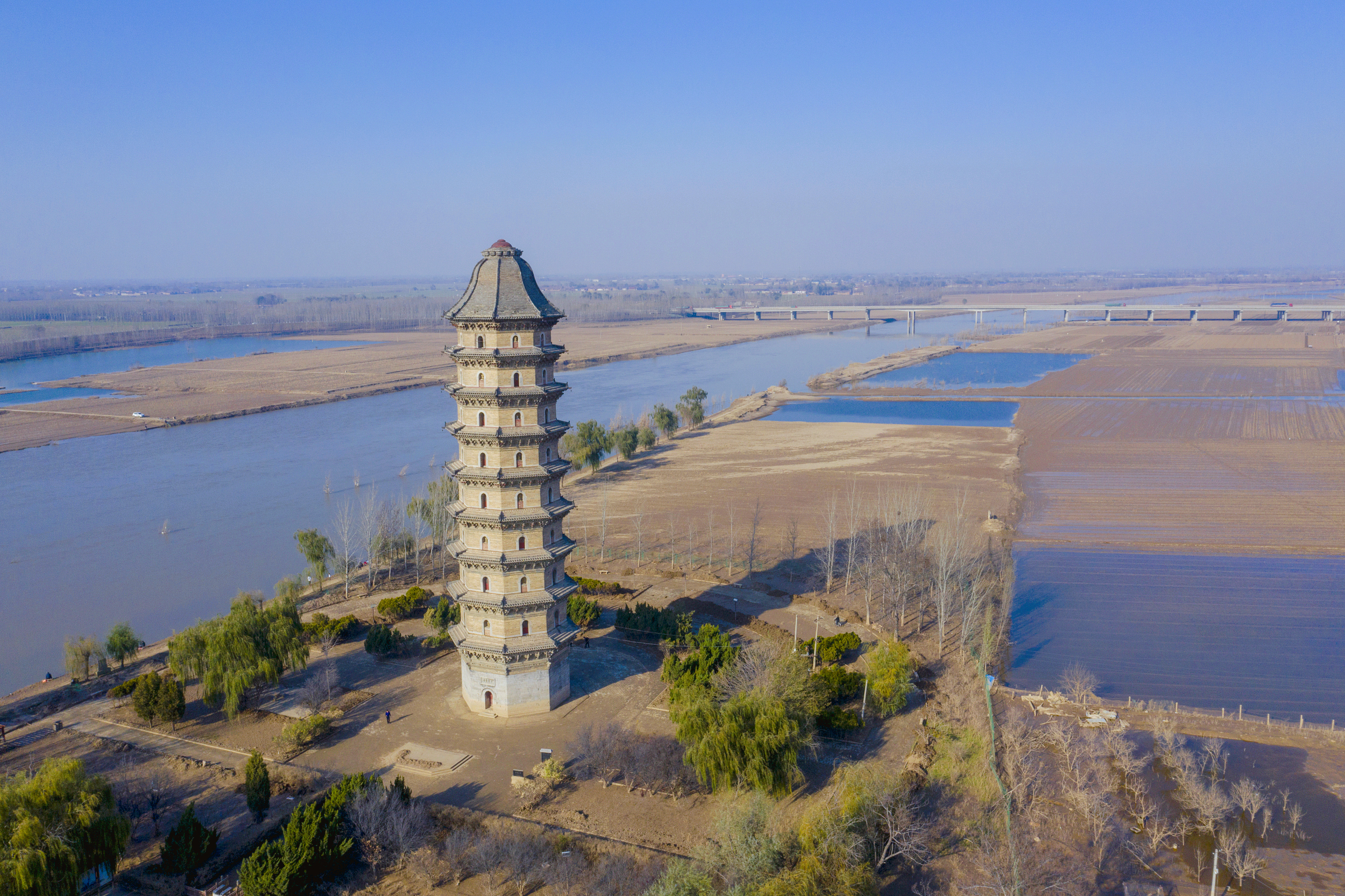 臨清舍利寶塔,坐落於山東臨清運河畔,始建於明萬曆三十九年(1611年),為八角九層樓閣式磚塔,塔高約61米,巍峨聳立,造型奇特。