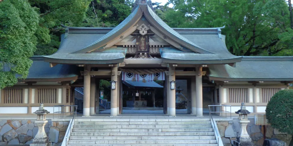 該神社位於宇和島市北端,它在1945年被空襲摧毀,後又於1957年被重建,神社的正面有一座壯觀的太鼓橋。