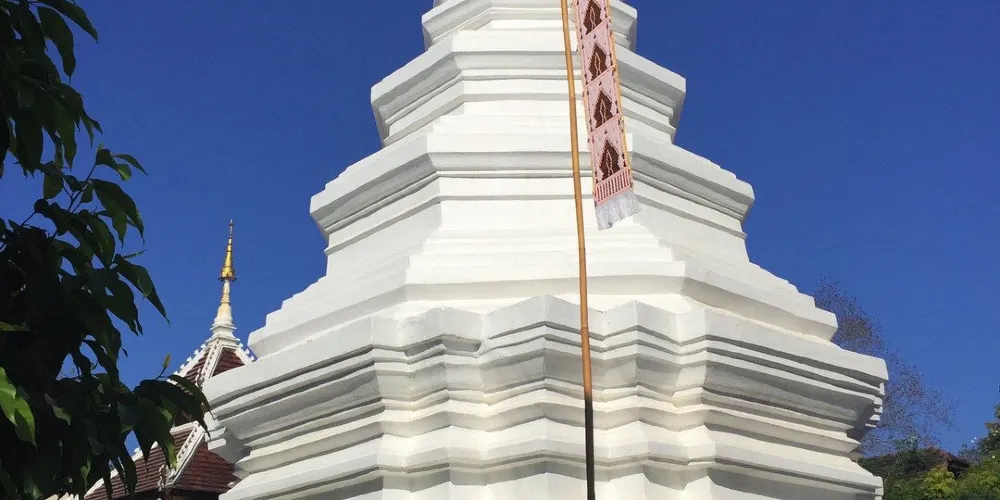 走進去之後,你就可以看到大佛塔,這座四方形蘭納式神聖佛塔建於1411年,高近80公尺。據說16世紀清邁發生一次大地震,佛塔的尖頂一夜之間塌毀。聯合國教科文組織和日本政府曾出資重建佛塔,但尖頂卻無法完成,因為沒人確切知道原先佛的上部結構是什麼模樣,所以現在所見的是平頂的佛塔。
