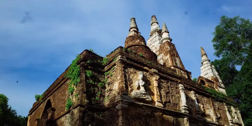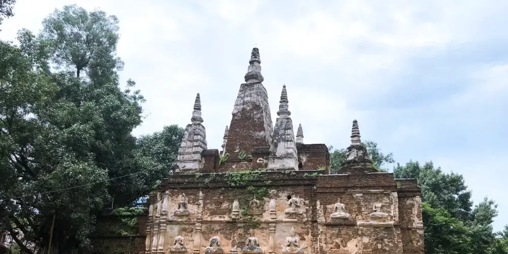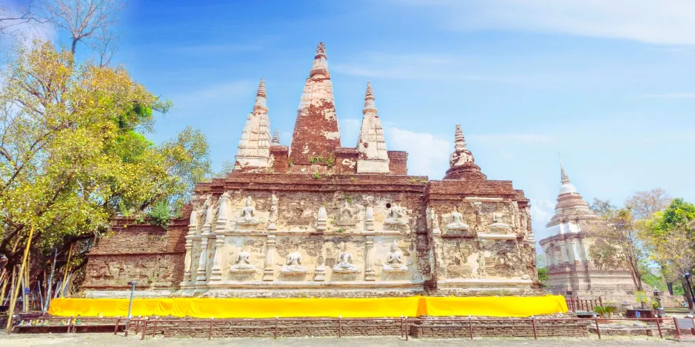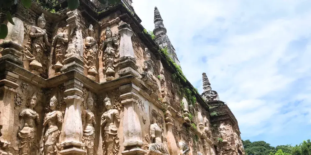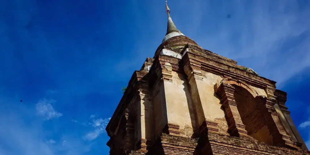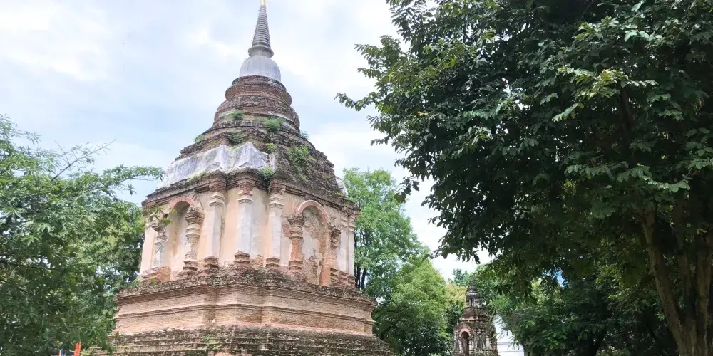 走進去之後,你就可以看到大佛塔,這座四方形蘭納式神聖佛塔建於1411年,高近80公尺。據說16世紀清邁發生一次大地震,佛塔的尖頂一夜之間塌毀。聯合國教科文組織和日本政府曾出資重建佛塔,但尖頂卻無法完成,因為沒人確切知道原先佛的上部結構是什麼模樣,所以現在所見的是平頂的佛塔。