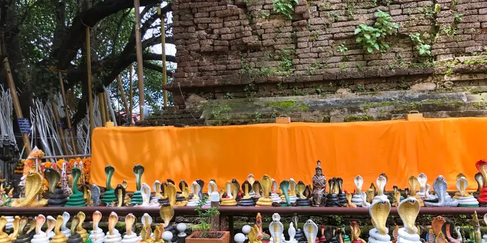 佛塔的四面雕有精緻的護塔靈蛇,蛇身則隨著階梯而上,但這些也是後來修復重建的。塔身上有六座大象雕塑,原來的大象雕塑大多已毀壞,現在其中五座是重新雕刻的水泥製品,右方的一座缺了耳朵和象鼻的是保留下來的原作,有興趣的可以仔細看一下。