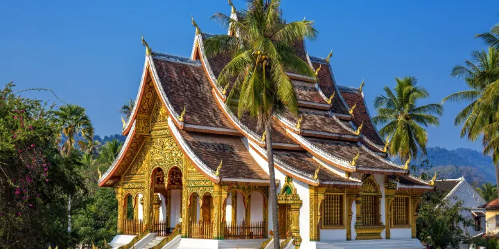 寺廟的屋頂是典型的琅勃拉邦五層木質結構風格,有裝飾精美的木柱和華麗的鎏金浮雕牆,最吸引人的還是佛殿大門和牆壁上貼滿的金木雕壁畫,有整部印度史詩《羅摩衍那》。