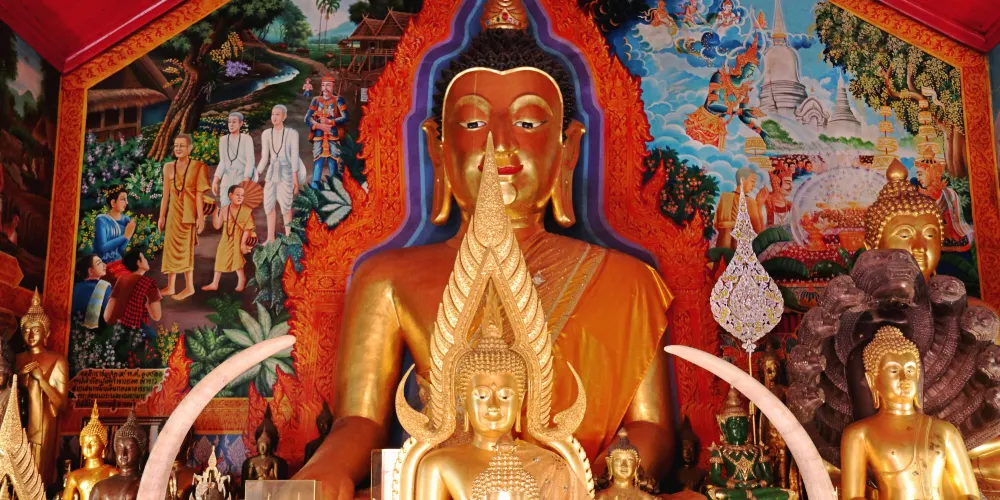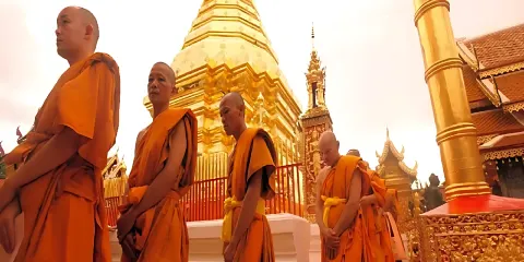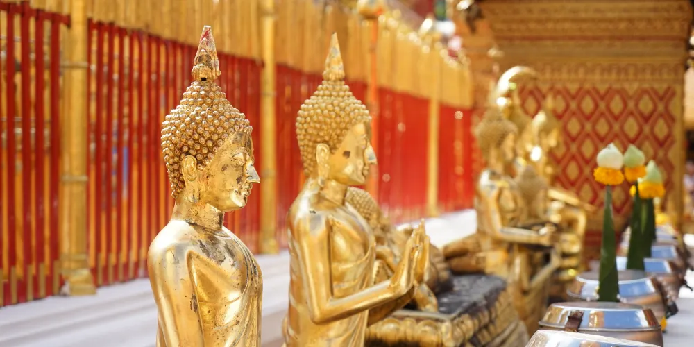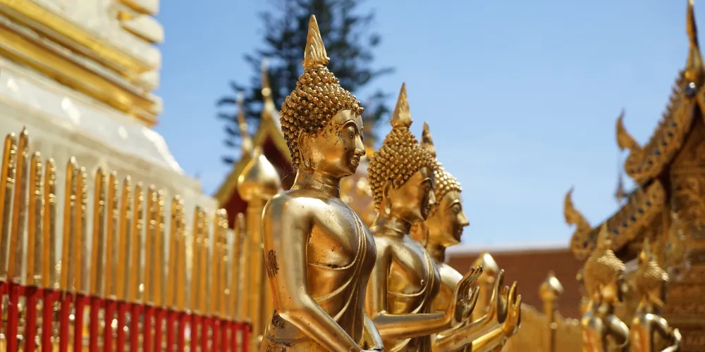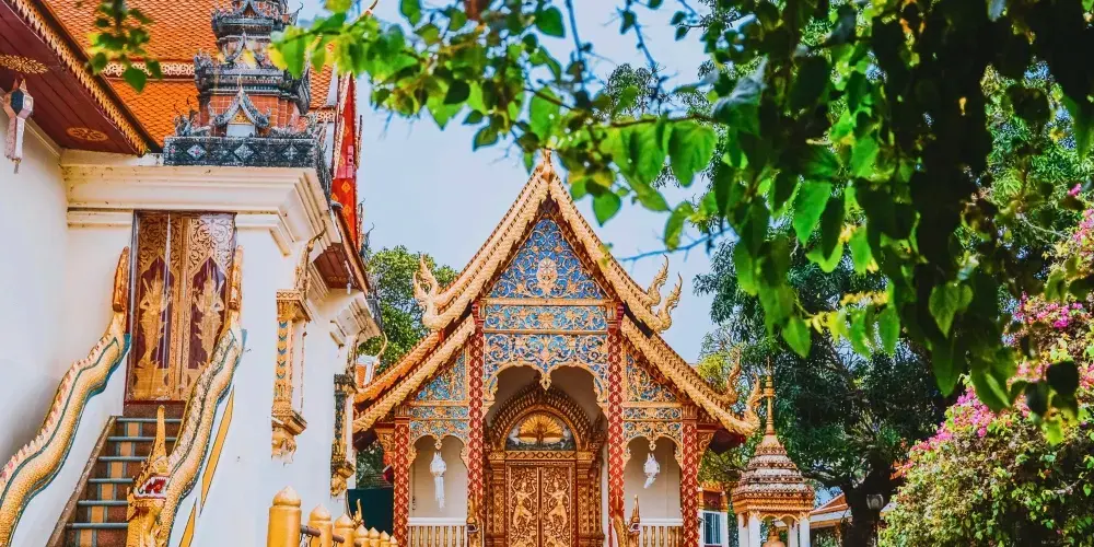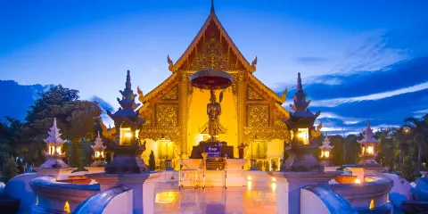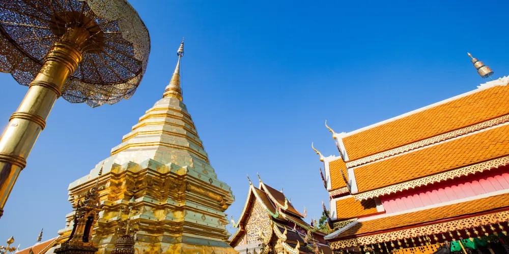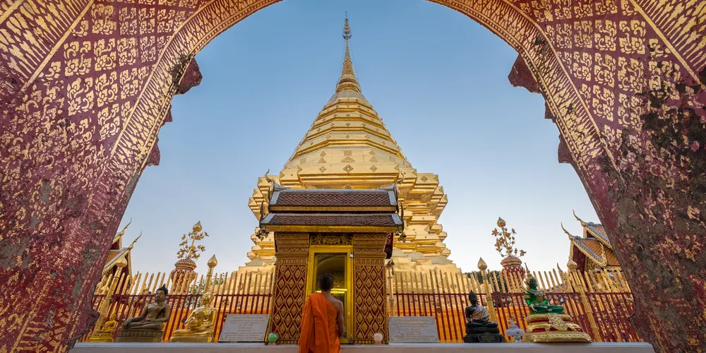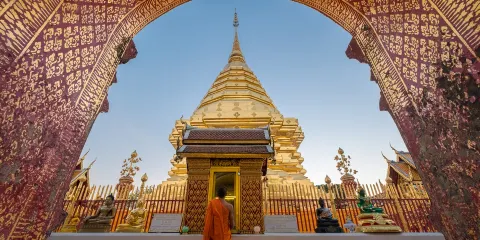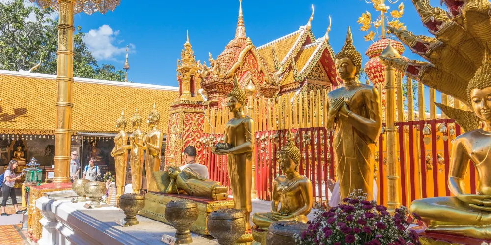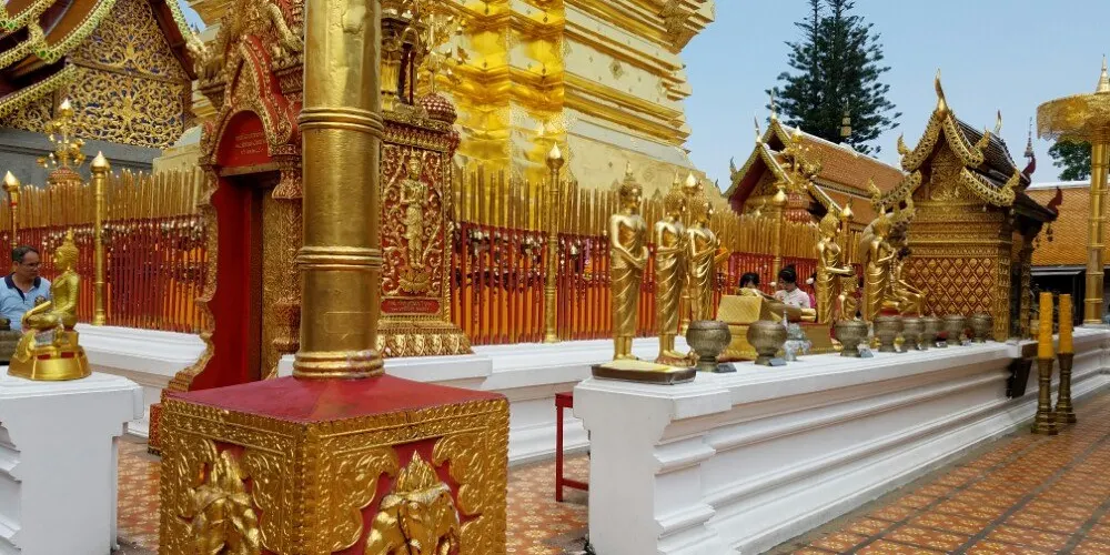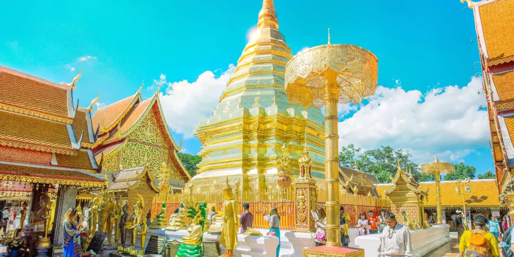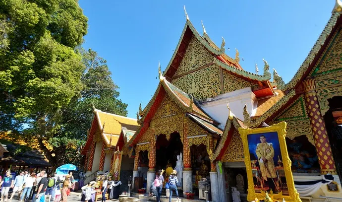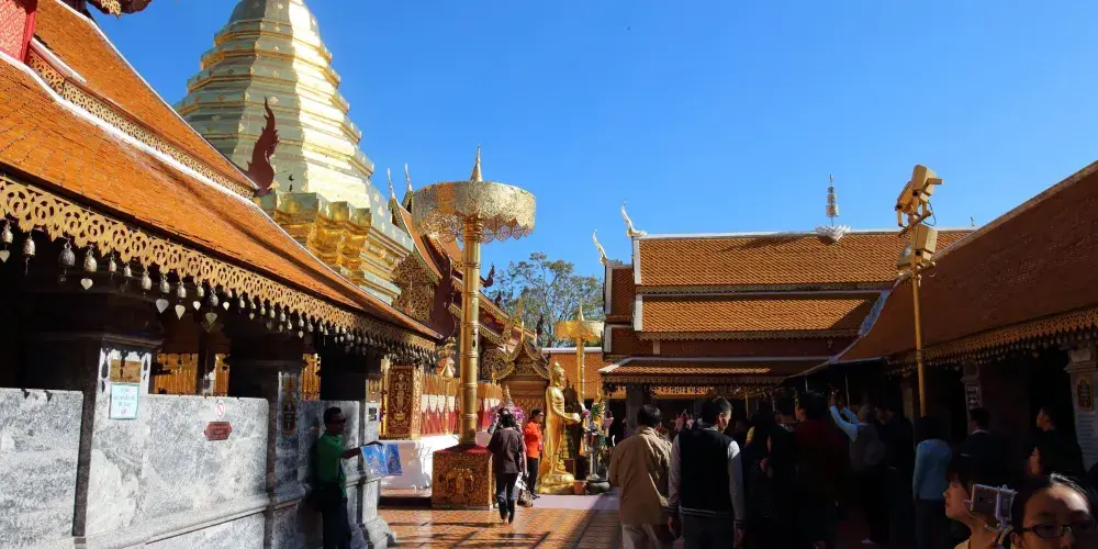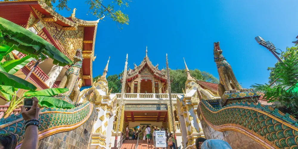 位於素貼山上的雙龍寺是清邁著名的佛教聖地,始建於公元1383年。傳說古蘭納國王將一頭背負佛骨舍利子的白象放歸叢林,白象來到素帖山後鳴叫三聲倒地西去,於是國王命人在此建造寺廟,寺廟門前的309級台階由兩條長龍雕塑守護,雙龍寺因此得名。步行300多級台階上到主殿,供奉釋迦摩尼舍利子的金塔就在主殿的正中心,參觀完還可以前往主殿後的觀景台俯瞰整個清邁市區。