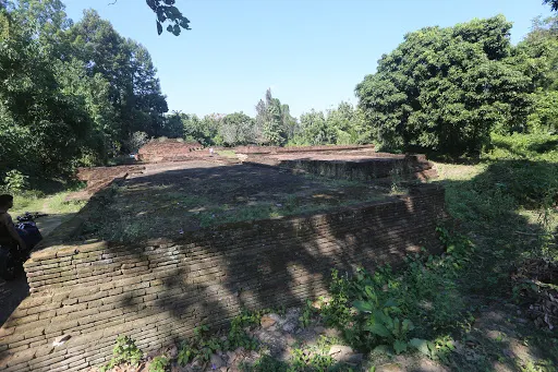 走進去之後,你就可以看到大佛塔,這座四方形蘭納式神聖佛塔建於1411年,高近80公尺。據說16世紀清邁發生一次大地震,佛塔的尖頂一夜之間塌毀。聯合國教科文組織和日本政府曾出資重建佛塔,但尖頂卻無法完成,因為沒人確切知道原先佛的上部結構是什麼模樣,所以現在所見的是平頂的佛塔。