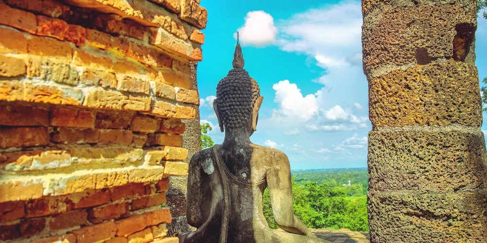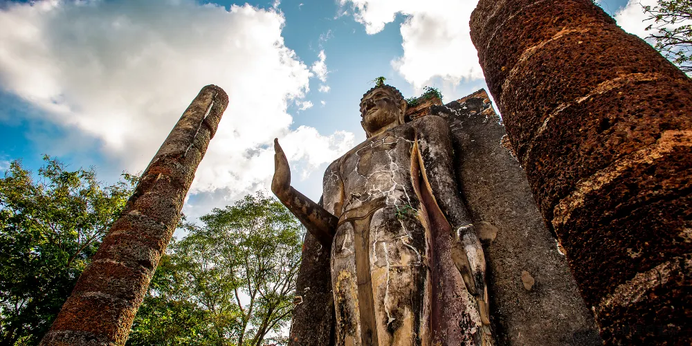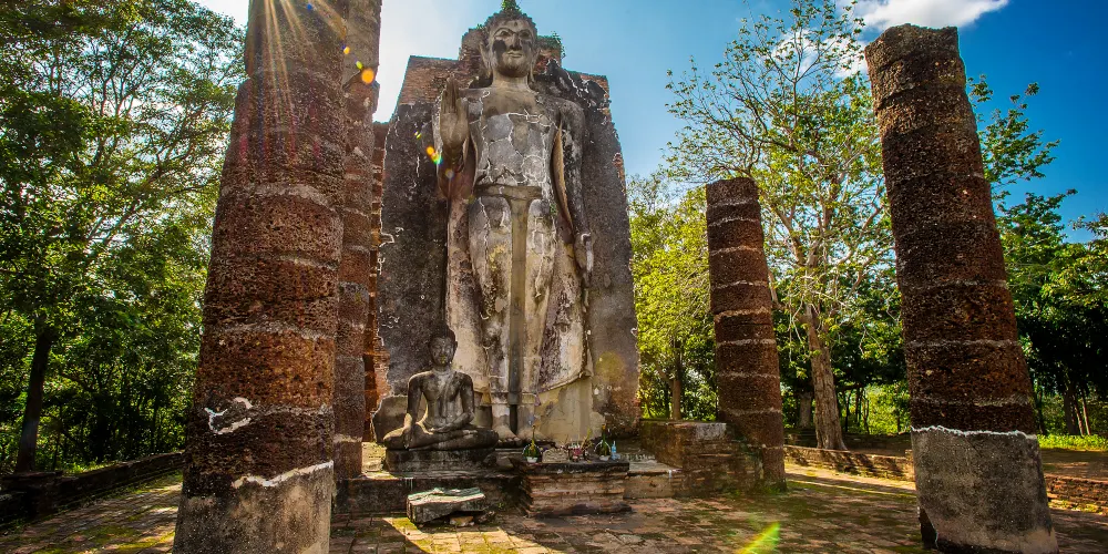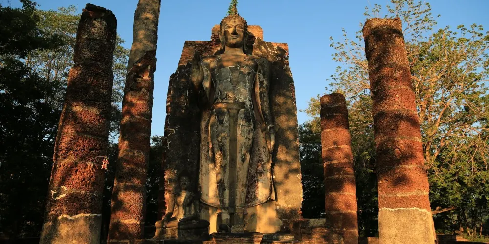 沙潘辛寺,位於古城以西的小山上,寺名的意思是“石橋”,寺廟如今已經成為遺址,位於古城以西的小山頂處,有一些殘留的大殿石柱和佛像。在這裏可以俯視素可泰古城,同時這裏也是看日出的好地方。