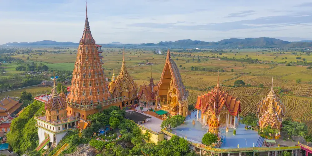 虎窟寺位於山頂,整個佛塔為磚色,分幾層,有高大的金佛,建築精美。