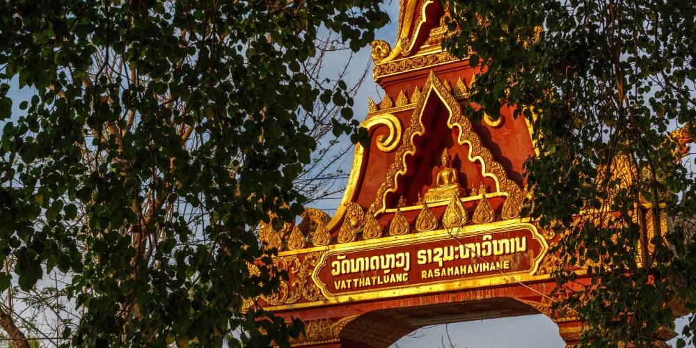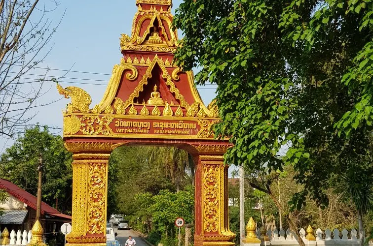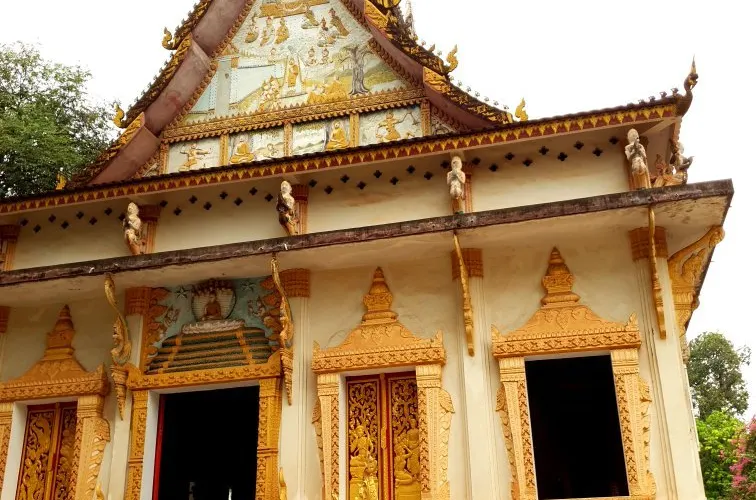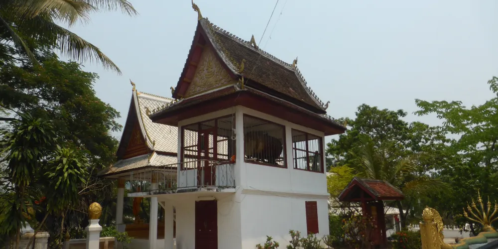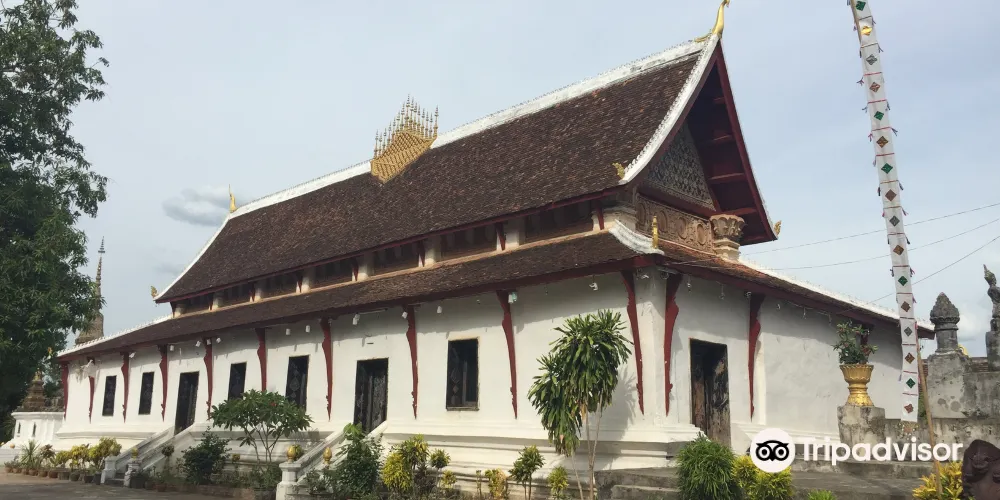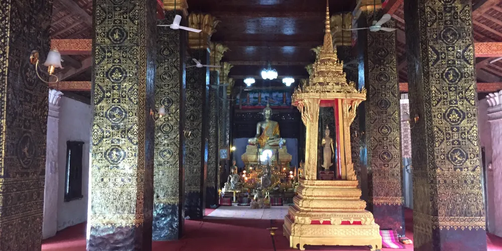 寺廟的屋頂是典型的琅勃拉邦五層木質結構風格,有裝飾精美的木柱和華麗的鎏金浮雕牆,最吸引人的還是佛殿大門和牆壁上貼滿的金木雕壁畫,有整部印度史詩《羅摩衍那》。