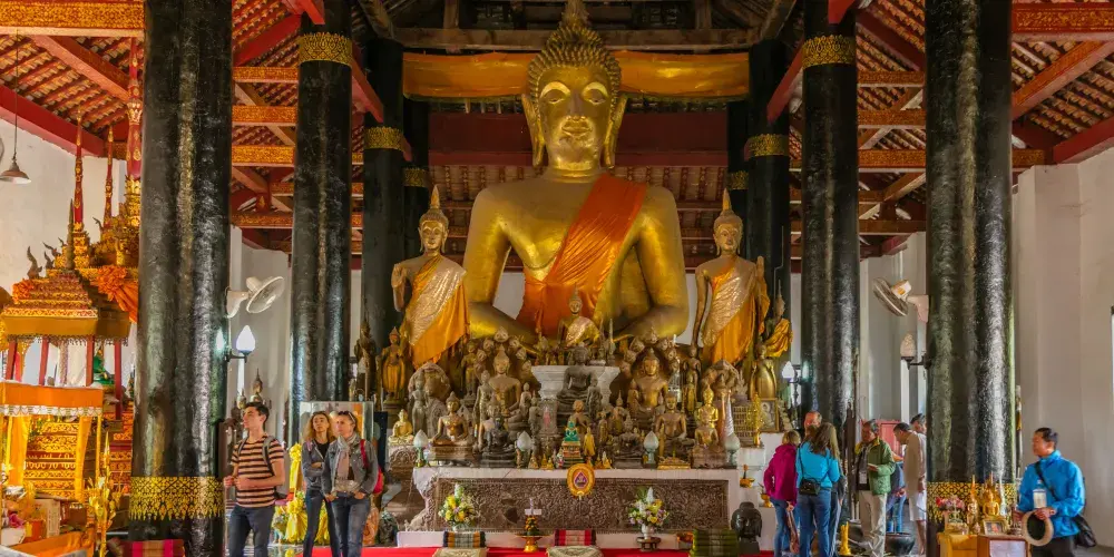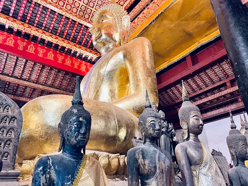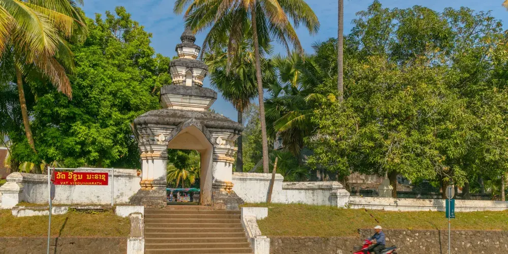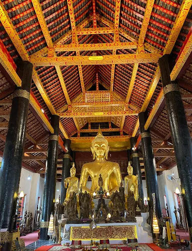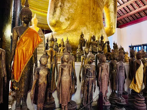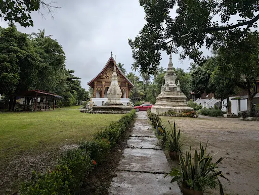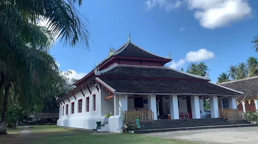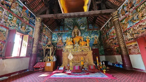 寺廟的屋頂是典型的琅勃拉邦五層木質結構風格,有裝飾精美的木柱和華麗的鎏金浮雕牆,最吸引人的還是佛殿大門和牆壁上貼滿的金木雕壁畫,有整部印度史詩《羅摩衍那》。