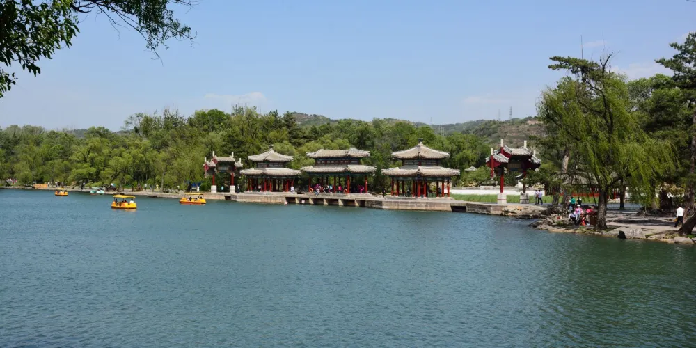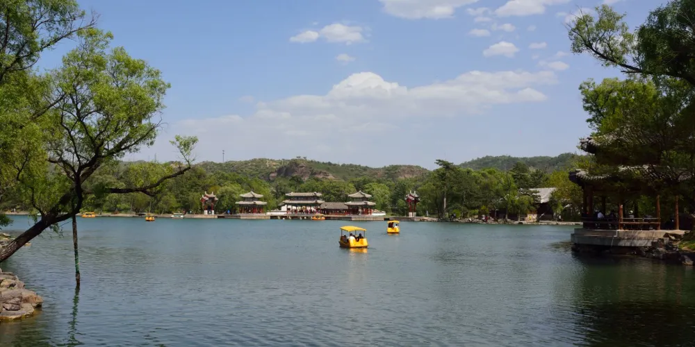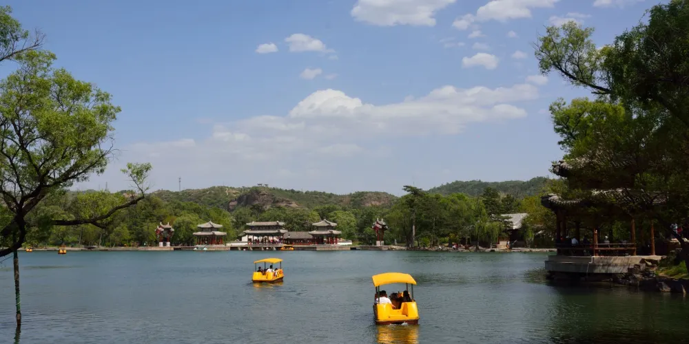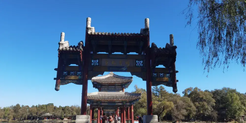 則評價在澄湖東側,仿江蘇鎮江金山景色而建。此山三面環湖,一面臨溪,極具江南水鄉秀色。“天宇鹹暢”正殿北面的上帝閣,是山莊湖區的高點,原供玉皇大帝的塑像,閣高3層。