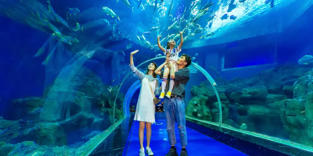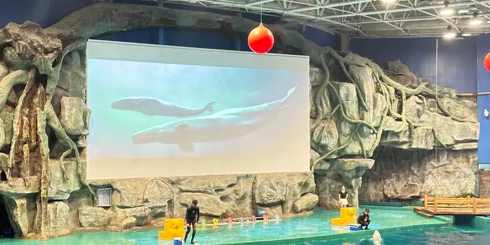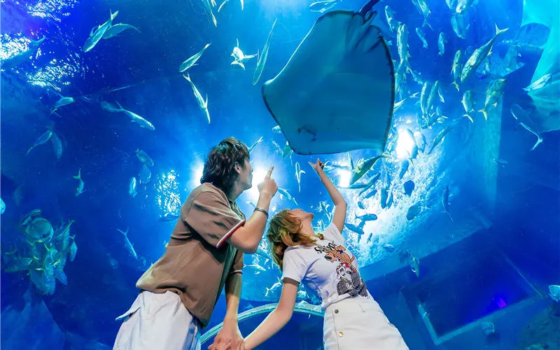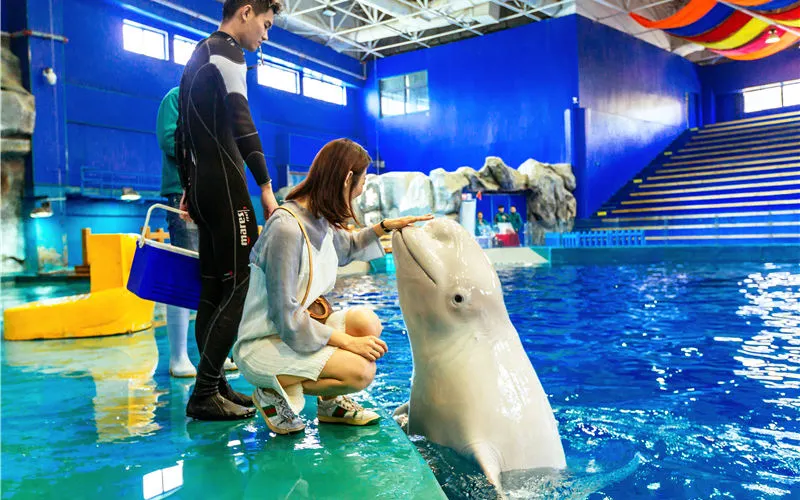 威海神遊海洋世界除了擁有來自俄羅斯的大白鯨、烏拉圭的毛皮海獅、日本的瓶鼻海豚以及從南極引進的白眉企鵝、白令海峽的北海狗,渤海灣的斑海豹等動物之外,還引進了上千種珍稀海洋魚類,並通過全透明的中心水池從各個角度進行展示。遊客可以近距離觀賞到人鯊共舞,萬魚搶食等獨特演齣節目,讓人彷彿置身真正的海底世界。