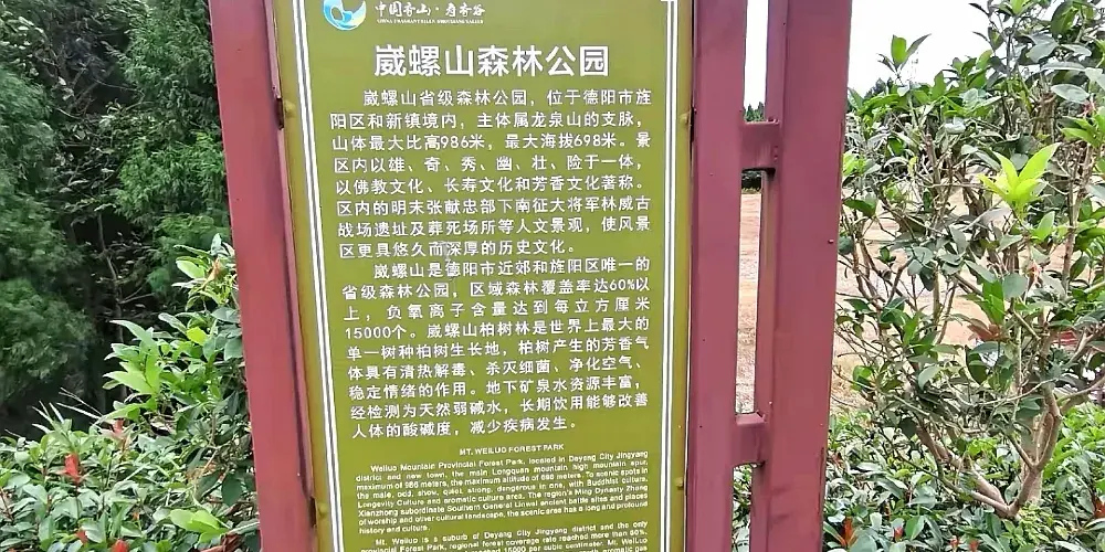 崴螺山森林公園,位於德陽市旌陽區和新鎮境內,主體屬龍泉山脈向東北延伸的—條支脈。景區內以雄、奇、剛、秀、幽、壯、險於一體,以佛教文化和長壽文化著稱川北中部地區。地下礦泉水資源豐富,森林茂密,野生動植物繁多。以及我國明末張獻忠率部南征大將軍林威古戰場遺址和葬死場所等人文景觀,使風景區更具悠久而深厚的歷史文化。