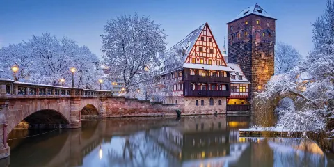每天紐倫堡聖誕集市在中央廣場 (Hauptmarkt) 上舉行。伴著中世紀的複古氛圍和濃鬱的聖誕氣息,在各個攤位你能淘到各種各樣的聖誕小物,品嘗地道的紐倫堡薑餅和烤腸等,還有全世界最大的火鉗酒 (Feuerzangenbowle)。
