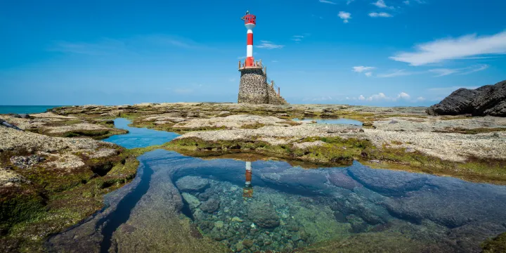 進入潿洲島西南端的鱷魚山景區,便可見到一座高高的燈塔,這便是潿洲島燈塔—潿洲島的標誌性建築之一。潿洲島燈塔雖然是島上的製高點,但目前卻不能登塔觀景,只能作為遊客拍照留念的背景。潿洲島燈塔設立於1956年,是作為附近往來船隻的導航標記,燈塔外側面貼白色仿石磚,內設旋轉樓梯,塔的上部有瞭望台。