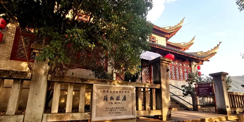 豐鎬房即蔣氏故居,是溪口鎮上重要的人文景觀。從前,按照當地的習慣,每個家庭都有房名,蔣氏在宗譜中屬“周”字輩,由此推及西周兩代皇帝建都的豐邑、鎬京作為自家的房號,希望自己的家族也能象西周一樣興旺發達,豐鎬房的名字就這樣定了下來。豐鎬房又名素居,是因蔣家世代信佛,吃素唸經,故而得名。豐鎬房佔地4800平方米,建築面積1850平方米。建築格局為前廳後堂、兩廂四廊,是傳統的世家府第格局。前廳及左右還有三個花園,有月洞門相通。中間小天井,兩邊有金銀桂花各一株,是宋美齡親手所種。東廂房留給宋美齡居住,但一直都空着。西廂房為毛福梅的住所。西廂房西側有幢獨立小樓,原系祖傳的三間房屋,這裡是蔣母王采玉舊居。為尊重祖宗,保留風水,豐鎬房擴建時所有新宅屋基,高度不能超出這幢祖居的屋基。豐鎬房裡還有三大看點,即雕刻、彩畫和堆塑。進入前廳,抬頭可見屋頂正中的堆塑,兩邊是“雙龍戲珠”。祭祖敬天的報本堂,是豐鎬房整個建築的核心。走廊兩端壁上有兩幅彩畫,東首是“八仙過海”,西首是“姜太公釣魚”。柱頭兩側的“牛腿”上是木雕,是《三國演義》中的故事,從東到西分別是“劉備招親”、“夜戰馬超”、“關羽戰長沙”和“回荊州”。東西廂房四個柱頭上的木雕也取材於《三國演義》,即“送皇嫂”、“古城會”、“上馬獻金”、“斬顏良”。東廂房走廊上的木雕,內容是《精忠岳傳》,有“湯陰大水”、“拜師周侗”、“操場比武”、“岳母刺字”。東廂房走廊上的雕刻是上八洞神仙的羣像,有鐵枴李、呂洞賓、韓湘子、何仙姑。還有“聞太師回朝”、“陳琳抱盒”、“岳飛收花槍”等彩畫。