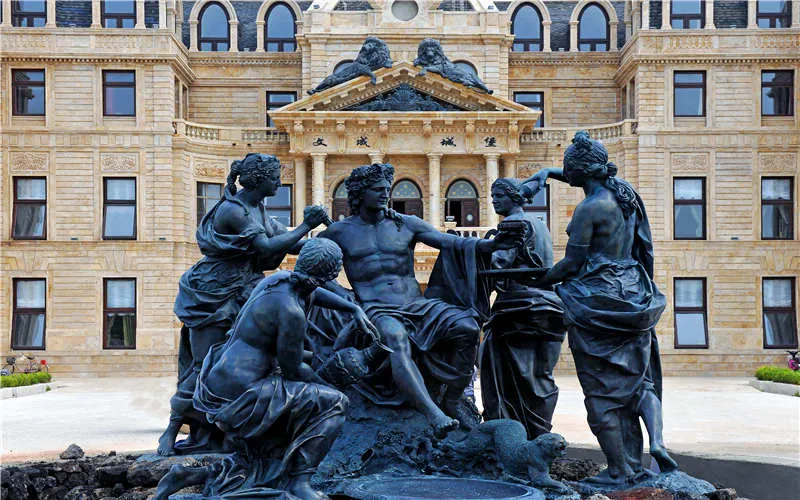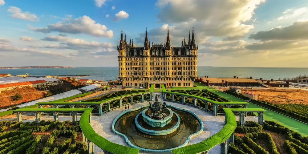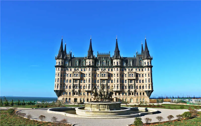 文成城堡位於煙蓬旅遊觀光大道旁,由歐洲建築元素巧妙組合而成,以巴洛克風格為主,以珍貴洞石為主建築材料,體現了貴族氣息。周圍有護城河環繞,內裝海水,可養海參、鮑魚,也可供人戲水划船。儘管只有4層高,但造型上典雅大方,圓形屋頂直指藍天,兩側梯形與錐形屋頂相互穿插,疊加交錯,壁爐煙囪點綴其間,充分表現出了歐洲技術所獨有的浪漫主義情懷和英雄主義氣概。