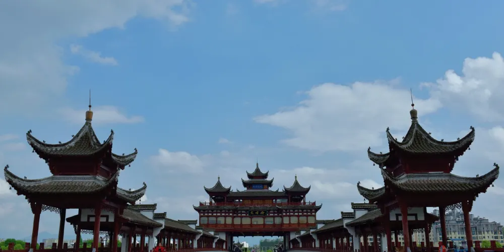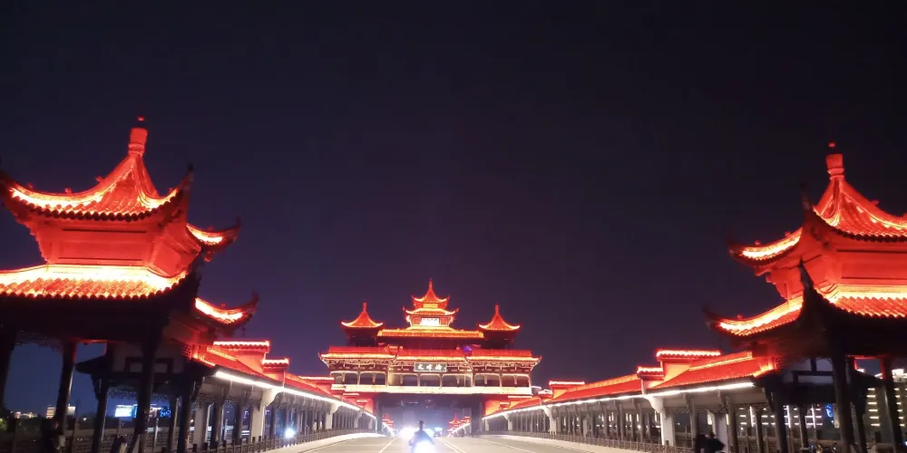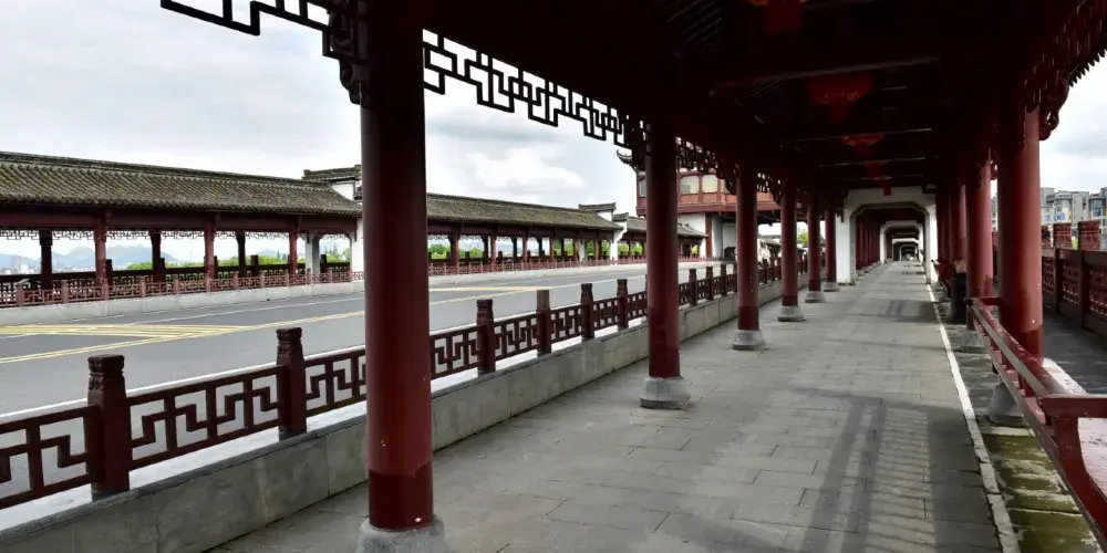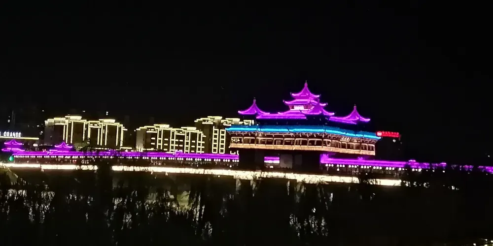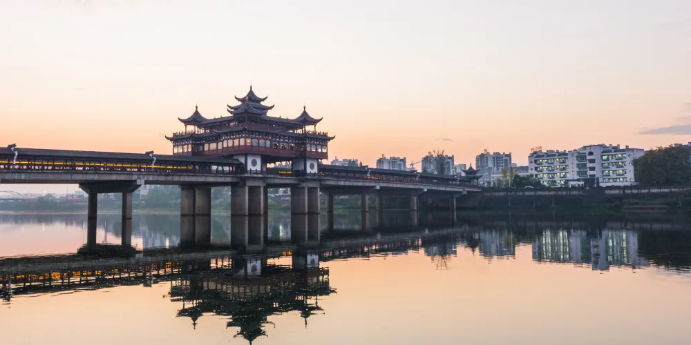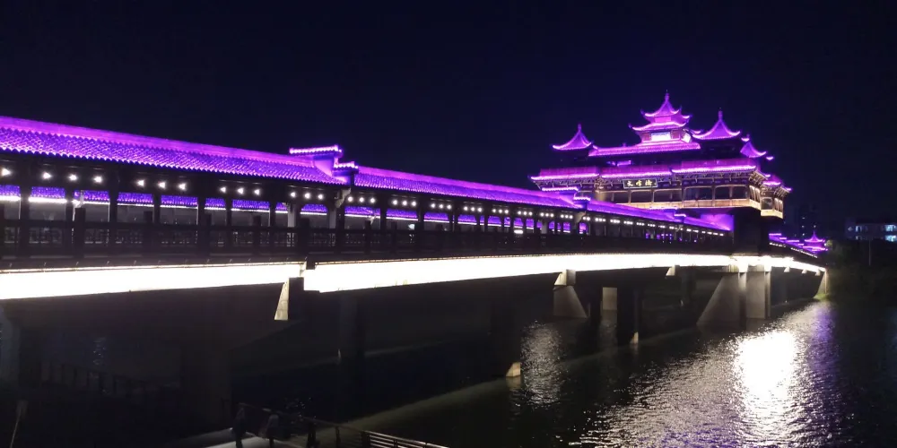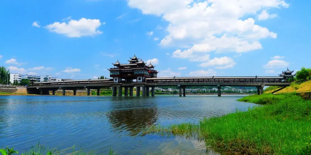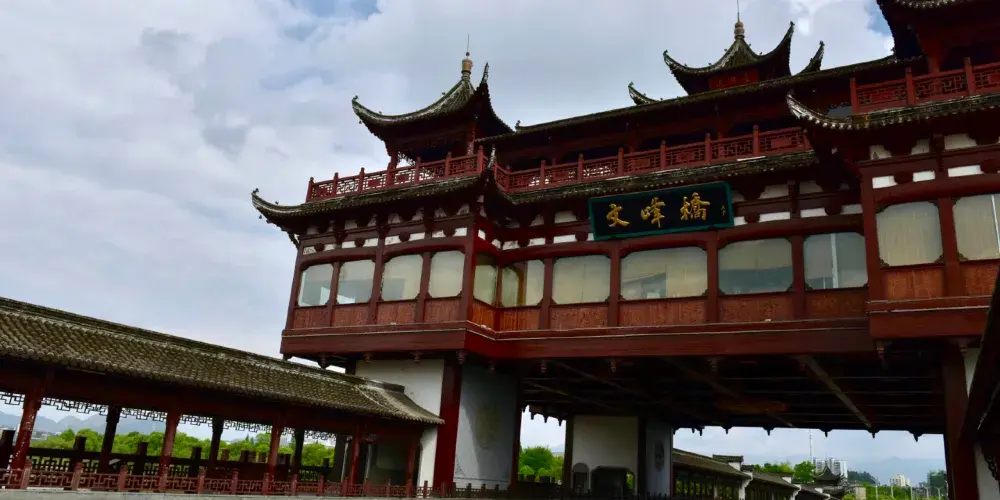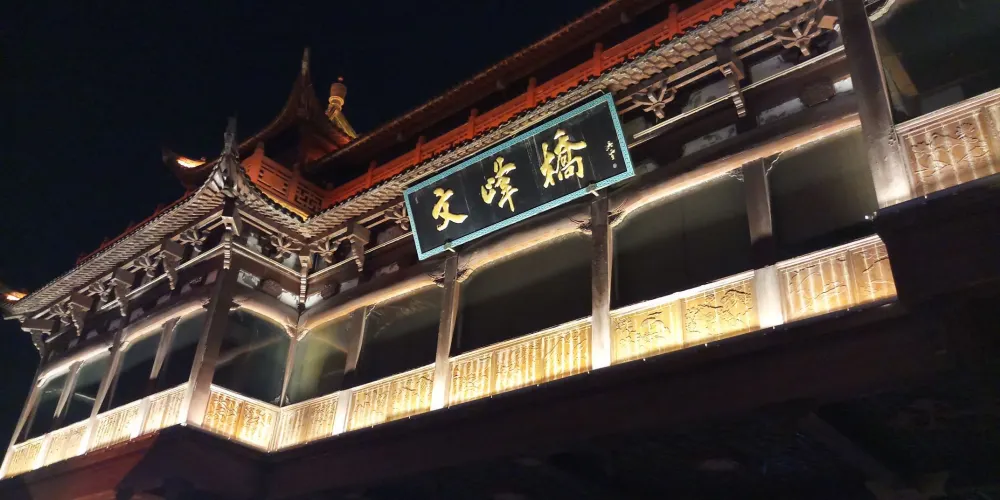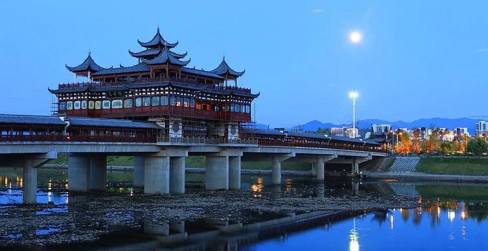 文峯橋位於黃山市率水、橫江、新安江三江交匯口西側,屯溪一中東南側,連接着北岸黎陽鎮與南岸陽湖鎮,於2013年8月31日通車。它不僅是交通要道,還是一道靚麗的風景。整個橋的樣子看上去像一座超級大的徽派廊橋,全長249米,中間是四車道。兩旁模仿廊橋的樣子,是供遊客在橋上行走觀光的長廊,有棚,具備遮陽擋雨的功能。橋當中有一座飛檐翹角高達27米的蓮花型觀景台。橋上的雕刻、楹聯等都充分展現了古徽州,特別是屯溪古往今來的歷史文脈。文峯橋上散散步,吹吹風,看新安江景;到了晚上,橋上亮了燈,還可欣賞美麗的夜景。