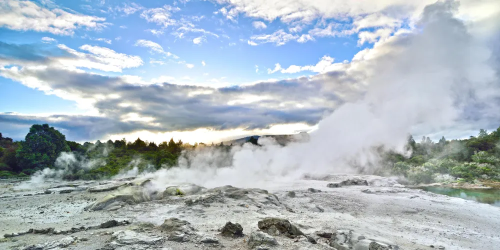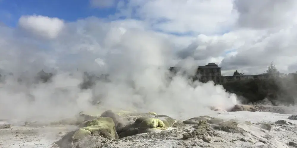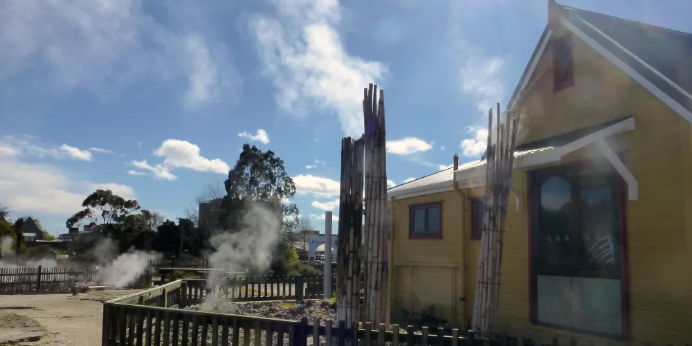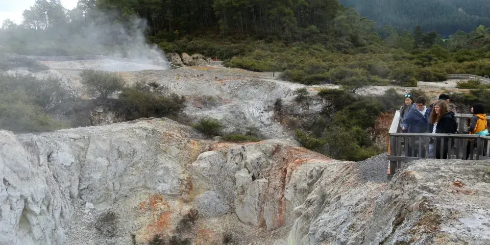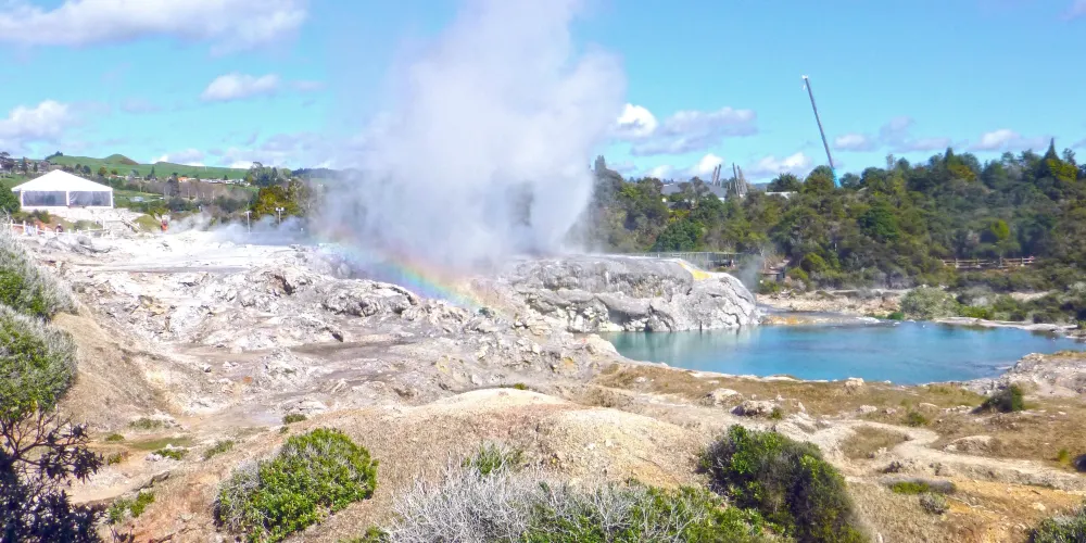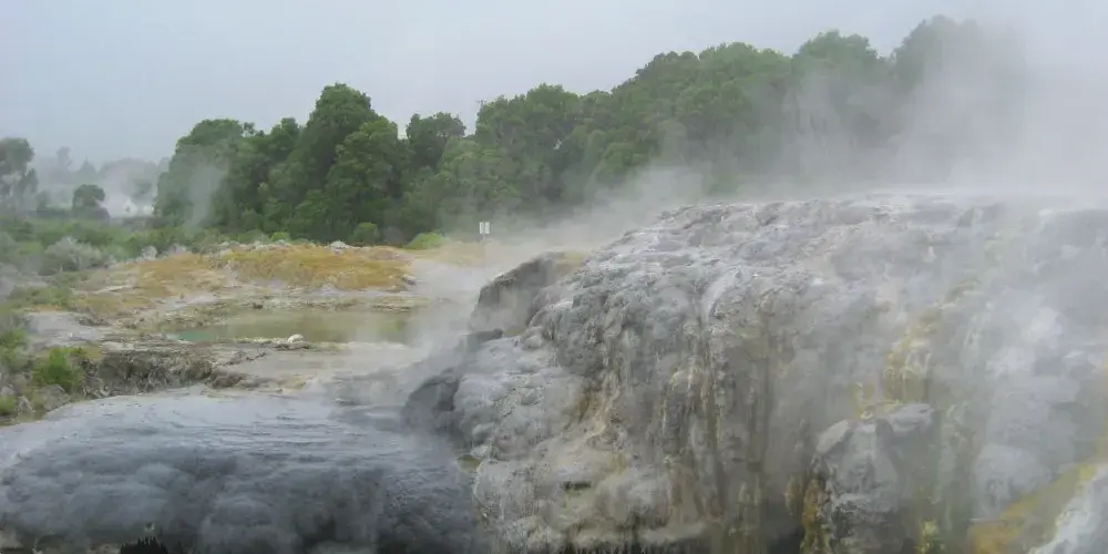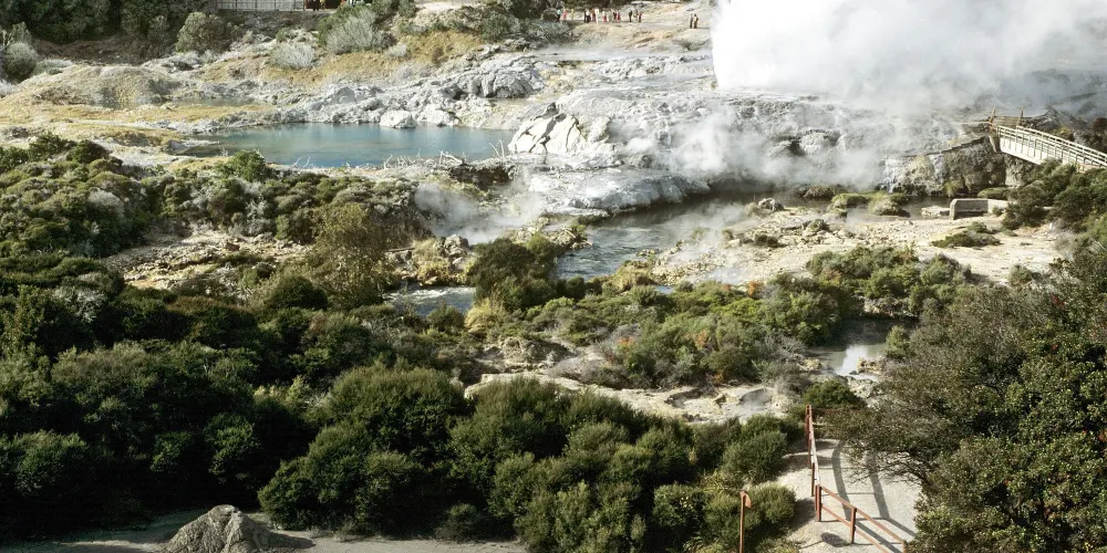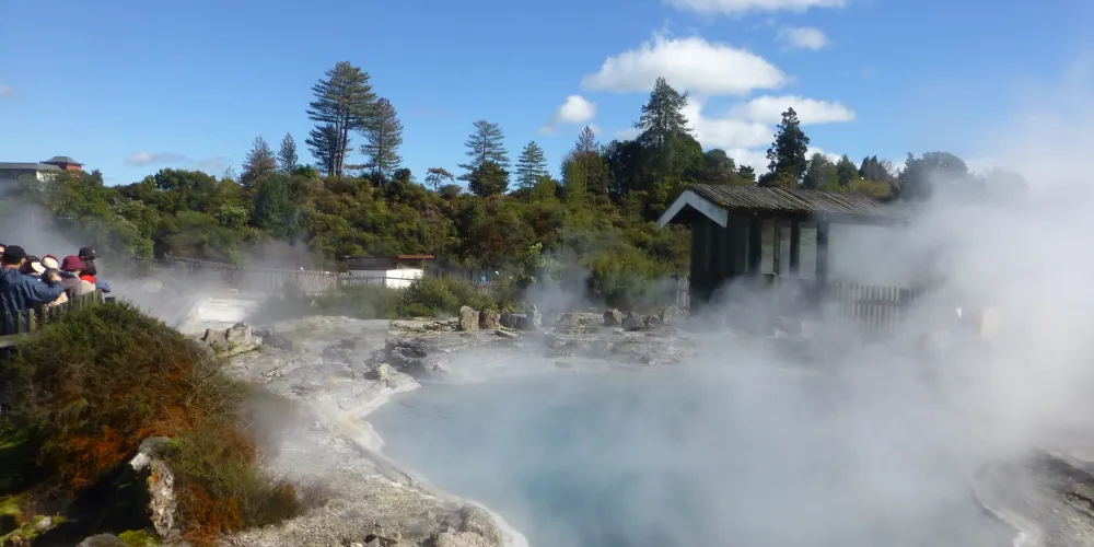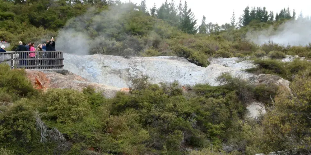 華卡雷瓦雷瓦地熱保護區(WhakarewarewaThermalArea)集溫泉奇景於一身。區內煙霧瀰漫,紐西蘭最大的間歇泉波胡圖(Pohutu),泉水噴出高達30公尺,通常每天噴出20次,擎天水柱傾瀉而出,蔚為奇觀,成為羅托魯瓦的最佳地標。