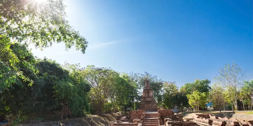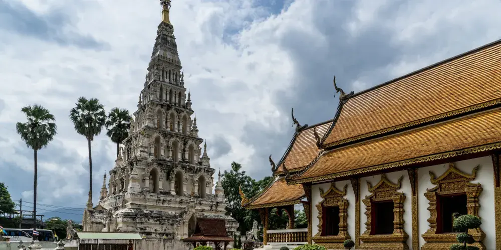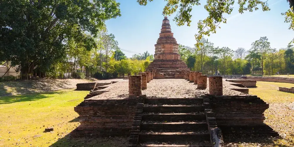 走進去之後,你就可以看到大佛塔,這座四方形蘭納式神聖佛塔建於1411年,高近80公尺。據說16世紀清邁發生一次大地震,佛塔的尖頂一夜之間塌毀。聯合國教科文組織和日本政府曾出資重建佛塔,但尖頂卻無法完成,因為沒人確切知道原先佛的上部結構是什麼模樣,所以現在所見的是平頂的佛塔。
