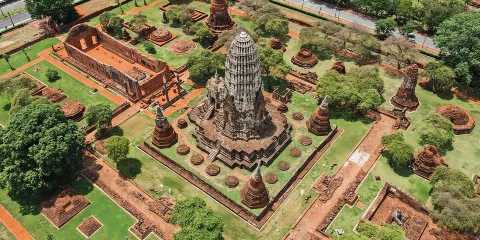 大城曆史公園囊括了大城三分之二的遺迹,包括大城王朝時期的王宮(即大城府遺址)、寺廟、博物館等共95處遺址,其中67處已淪為殘垣斷壁,僅有4座寺廟仍在使用,大城寺廟多為高棉風格及斯裡蘭卡風格。