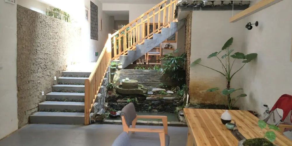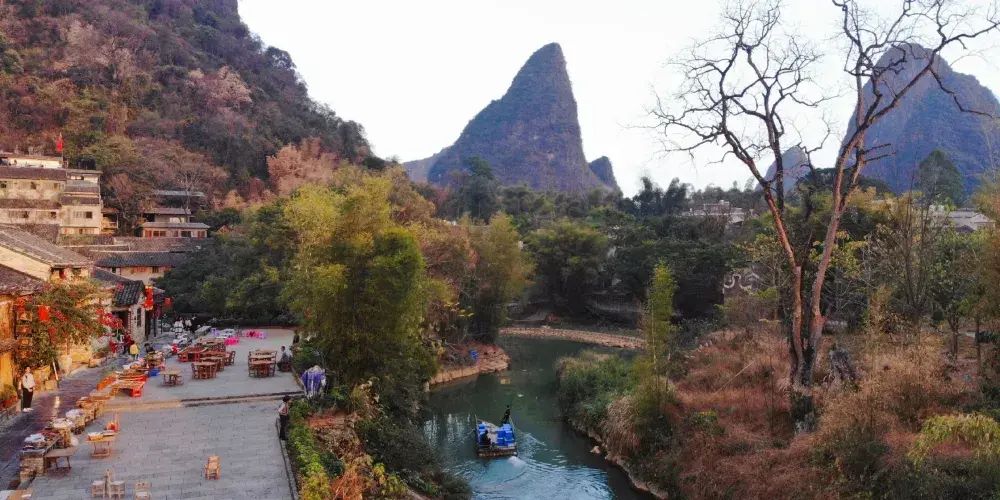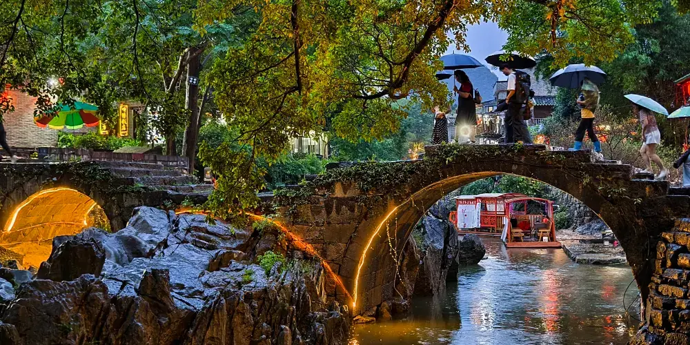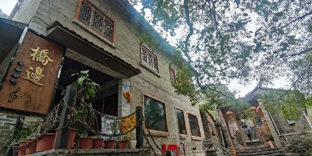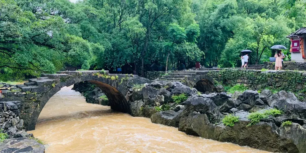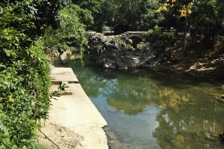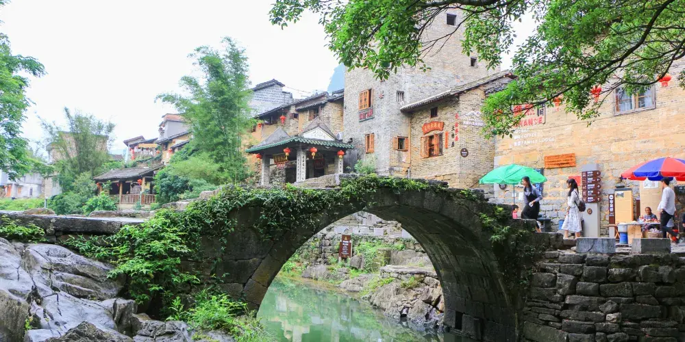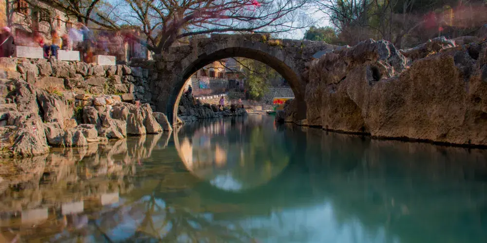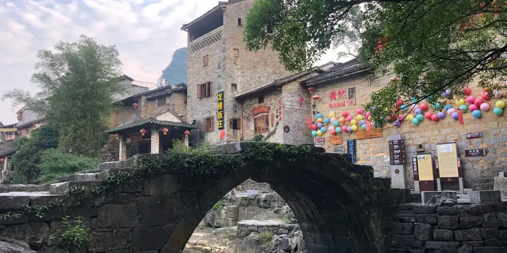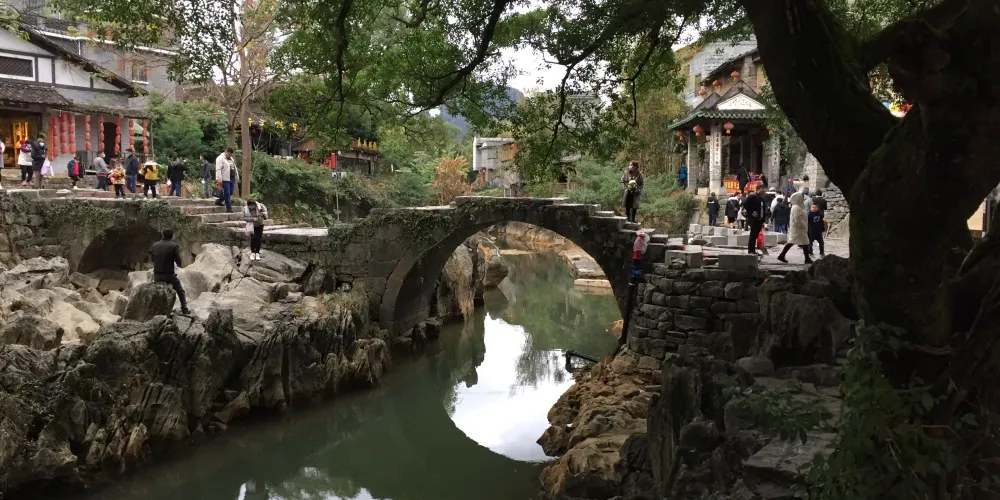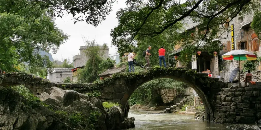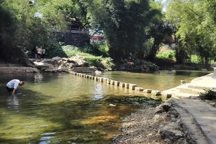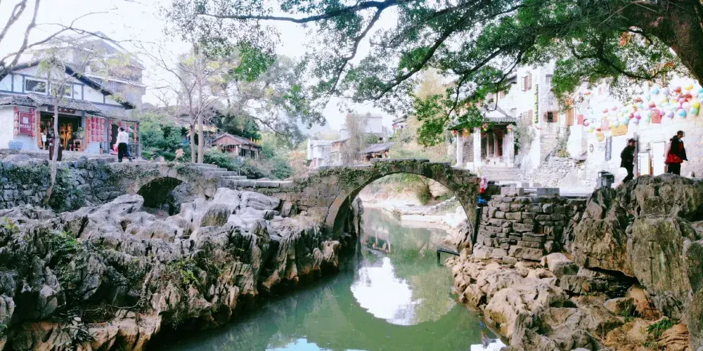 石跳橋是黃姚古鎮景點之一,整座橋長19m,由31個石墩組成,石墩由兩塊高矮不同長寬相同(約35㎝)的正方形面青石條組成。高石墩露出水面,較矮的石墩埋於下方,起支撐作用,而31個石墩間距按人行走步伐恰當排列,既利人行,又不影響泄洪。而且由埋在河床下的松木固定在一條直線上,上小下大,既小巧,又牢固。