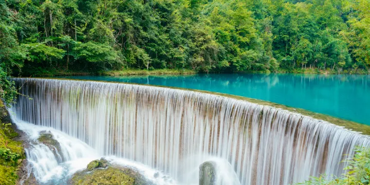 小七孔景區-卧龍潭是喀斯特暗河臥龍河的出口,也是荔波小七孔景區的一個經典景觀,因攔河壩形成的綠水深潭、滾水瀑布及傳說的臥龍而得名。從地表看它只是臥龍河的源頭,之後因為築壩發電引入響水河,成為了兩河的總水源。